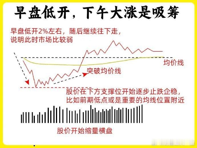 在分时图里,早盘低开2%左右,随后继续往下走,说明此时市场比较弱,但是成交量出现缩量。股价在下方支撑位开始逐步止跌企稳,比如前期低点或是重要的均线位置附近,股价开始小幅度上涨,成交量温和放大,全天还是处于下跌,等到下午,股价出现大幅拉升,创出当天的新高,这其实是主力低位吸筹,注意的是,股价下跌的时候是否下方有支撑力度