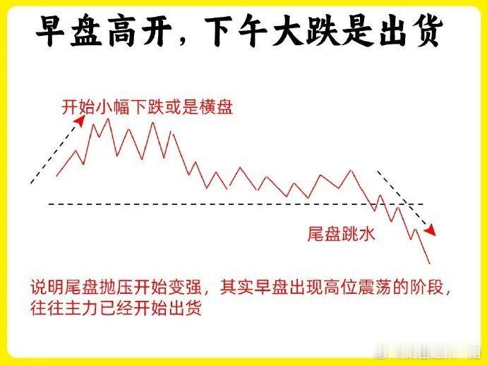 股价经过长时间的上涨以后,在波段的高位,分时图里,早盘高开以后,并没有继续上涨,而是开始小幅下跌或是横盘,到了尾盘还出现了大幅下跌,也是我们常说的尾盘跳水。说明尾盘抛压开始变强,其实早盘出现高位震荡的阶段,往往主力已经开始出货