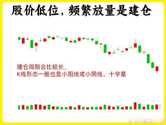 股价经过长时间的阴跌以后,开始低位横盘,成交量出现逐步放量,股价却没有出现明显的上涨,随后股价开始缩量,成交量会处于一种逐步放量在缩量,回归到平均水平的一个过程,这往往就是主力在低位偷偷建仓,当然这种建仓周期会比较长,K线形态一般也是小阳线或小阴线,十字星