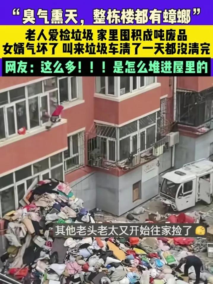 河北一老人爱捡垃圾,家里囤积了成吨的废品,导致屋内臭气熏天,滋生了很多蟑螂,严重影响了整栋楼的卫生! 子女多次劝说无果,只好叫来垃圾车,强行清理屋内的垃圾。 扔出楼的垃圾都快堆成小山了,忙活了了一整天都没清理完。这老人也太能囤了,估计家里都被垃圾塞满了! 很多邻居在现场围观,甚至其他老人还趁机捡拾被丢弃的废品。 有网友表示,一鲸落万物生,看似干净了一家,实则充实了好几个老头老太太家! 估计这位老人有囤积症,什么东西都想留着,就连捡的垃圾都舍不得拿去卖。 老人去捡点塑料瓶、废纸箱等垃圾,大多数子女应该都不会反对,既能锻炼身体,还能挣点零花钱。 捡废品并不丢人,但一定让家里保持干净卫生,这样才不会影响自己的身体健康。