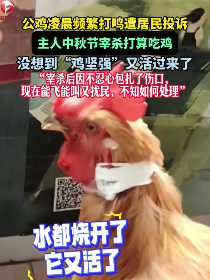 这只公鸡的求生欲太强了! 公鸡凌晨频繁打鸣遭邻居投诉,主人只好狠心将它宰了吃掉。没想到放了一碗血后,公鸡竟然奇迹般的活了过来。主人不忍心,给它上了药并包扎伤口,这只公鸡现在还活得好好的。 这事发生于贵州贵阳,女子家里养了一只公鸡,可是它偏偏喜欢在凌晨两三点打鸣。 邻居家多次半夜被吵醒,就和女子说了这事。女子多次教育公鸡,可是它却屡教不改。这只公鸡是家里的母鸡孵出来的,女子对它还是挺有感情的。 在收到邻居多次投诉后,女子最终狠下心来,准备在中秋节这天把它宰了吃肉。 在它流了大半碗血之后,女子已将水烧开,正准备褪毛的时候,没想到公鸡竟然活了过来,还从窗户飞到院子里。 女子见它可怜,就给它敷了药,并包扎了伤口。没想到这只公鸡求生欲极强,竟然奇迹般地活了下来,并且还越来越精神了。 然而,这只公鸡虽然在鬼门关走了一遭,却仍然不知悔改,还像往常一样在半夜愉快地打鸣。果不其然,女子一家又遭到了邻居投诉。 现在女子真的不知道拿它咋办了,将它宰了又舍不得,要是不处理吧,这样影响邻居也不好。 这事引发热议,有网友调侃道:公鸡心想,自从放了一点血,意外感到神清气爽,打鸣也更有劲了! 也有网友建议,要是真舍不得处理,那就给它买个隔音箱,或者晚上给它戴个嘴套。 人非草木,孰能无情。毕竟是自己养大的公鸡,主人对它有感情也很正常。举刀时的犹豫,包扎伤口时的心疼,折射出了女子骨子里的善意和温柔。 对于这件事,大家有什么好的解决办法吗?