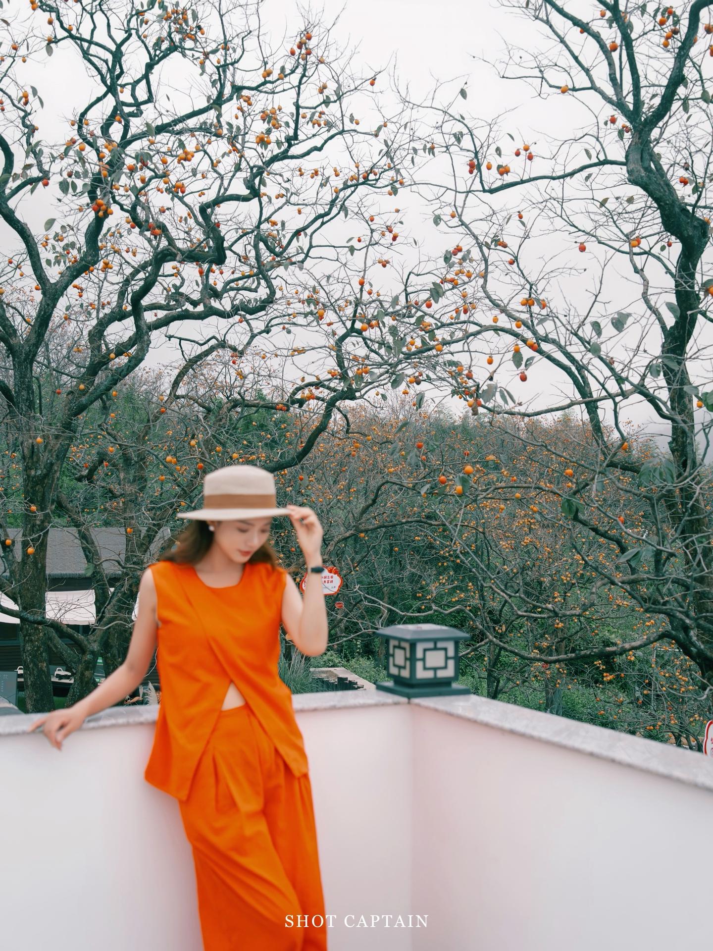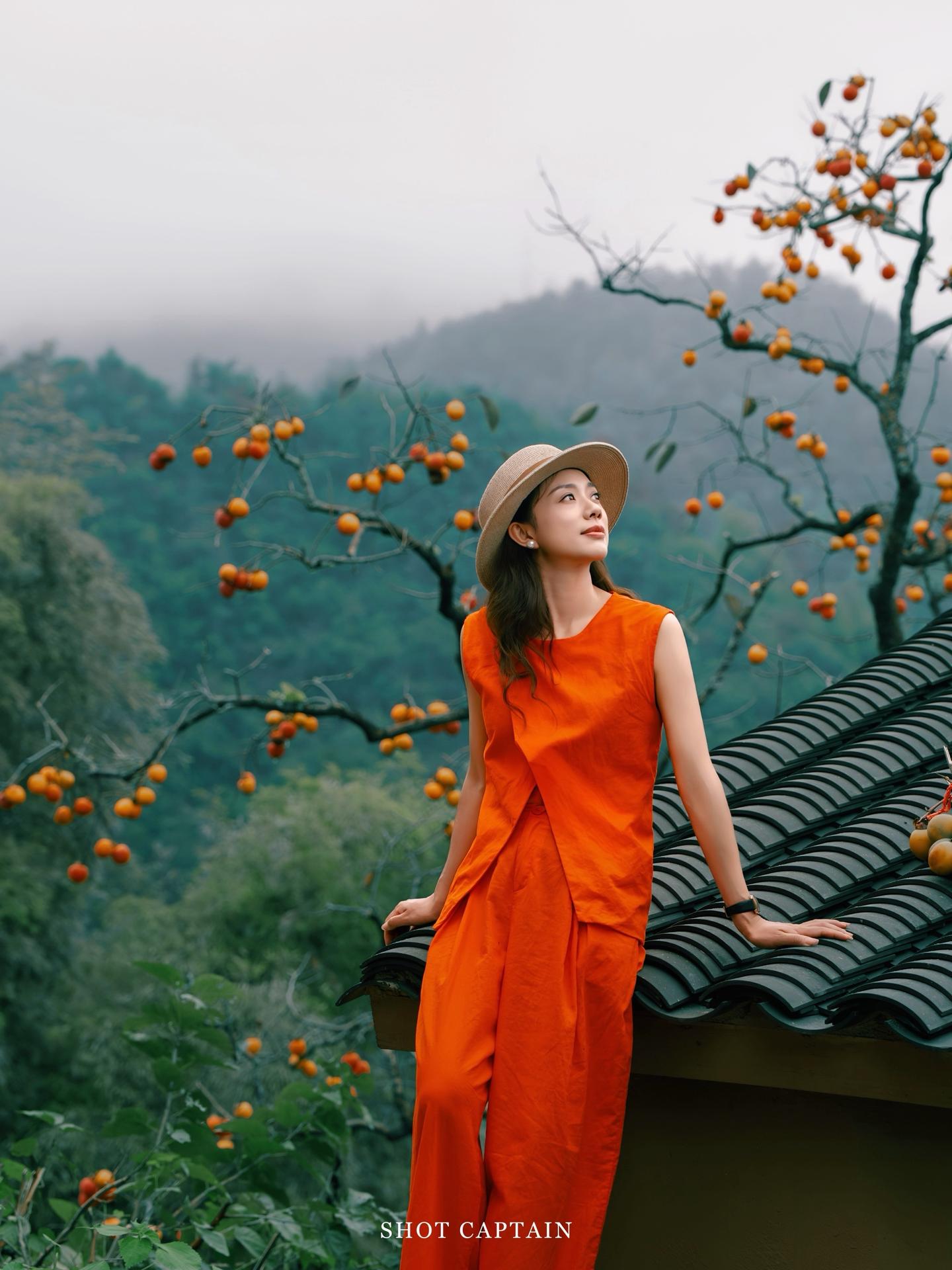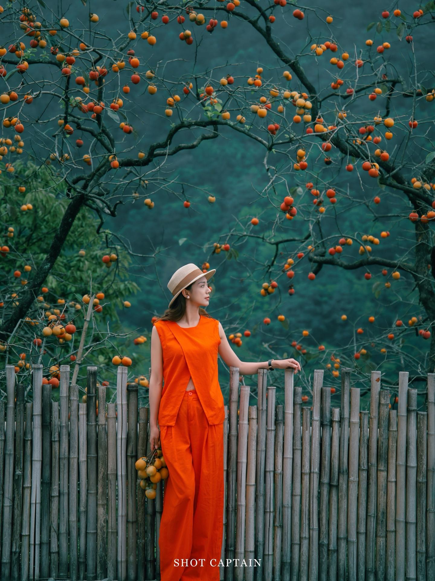 新昌兢山这配色才是秋日顶流!📒新昌兢山柿林红透如灯笼,穿橙色衣服打卡...