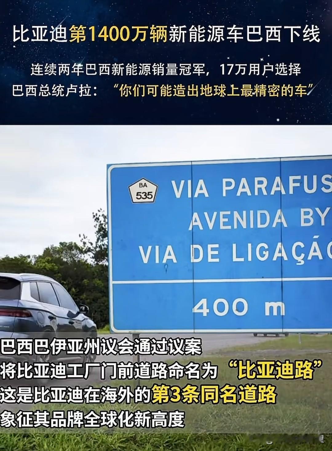 比亚迪第1400万新能源下线,标志着比亚迪全球化迈入新阶段,巴西总统卢奇,比亚迪总裁王传福,以及中国驻巴西大使祝青桥见证这重要时刻。比亚迪新能源汽车在巴西连续两年销冠,可见巴西人要有多喜欢比亚迪新能源汽车。巴西巴伊亚洲议会通过议案,将比亚迪巴西工厂门前的道路命名比亚迪路,看来巴西政府很重视比亚迪,厉害了我的迪。