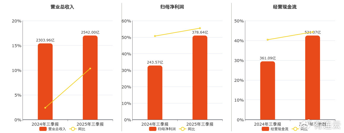 公司营业总收入为2542.00亿元,较去年同报告期营业总收入增加238.03亿元,实现5年连续上涨,同比较去年同期上涨10.33%。归母净利润为378.64亿元,较去年同报告期归母净利润增加135.06亿元,实现2年连续上涨,同比较去年同期上涨55.45%。经营活动现金净流入为521.07亿元,较去年同报告期经营活动现金净流入增加159.98亿元,实现5年连续上涨,同比较去年同期上涨44.31%。
