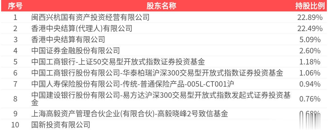 公司股东户数为52.98万户,前十大股东持股数量为155.10亿股,占总股本比例为58.36%,前十大股东持股情况如下: