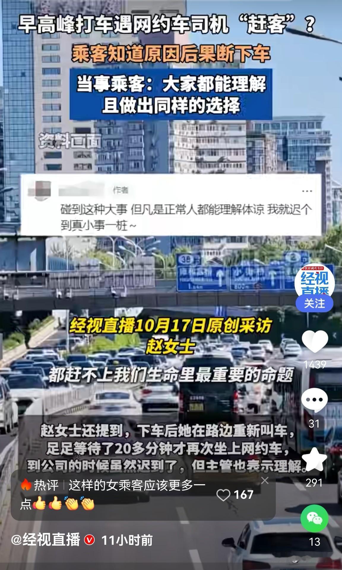 “我爸病危,能让我半路下车吗?”早上9点,北京二环早高峰堵成停车场,谁料网约车里突然上演这么一出“紧急协商”戏码。 听到司机师傅边停路边含泪的话,后排赵女士秒懂,连安全带都没系稳就嗖地跳下去,顺手“咔嚓”两下,拍下车牌+计费截图,留给单位打卡当证据,也给司机让出救命通道。 五分钟后,这段录音被司机发在社交平台:“感谢乘客推我一把,抢到黄金5分钟。”评论区瞬间破防:“成年人的善良,是理解彼此的兵荒马乱”,“规则之上,还有心跳”,“城市不是钢铁,是无数这样的瞬间”。 没有投诉,没有议价,没有“我凭什么让”的拉扯。赵女士说,谁还没个天塌的时候?司机则说,这趟车免单,但人情我记一辈子。 在分秒必争的算法里,他们手动按下了“暂停键”,让一条规则长出体温,原来“不守规矩”的温柔,才是城市最硬核的秩序。 生活不是剧本,善意没有彩排。早高峰的那束光,照进来刚刚好。 北京网约车网约车正能量记录我的2025 记录真实生活