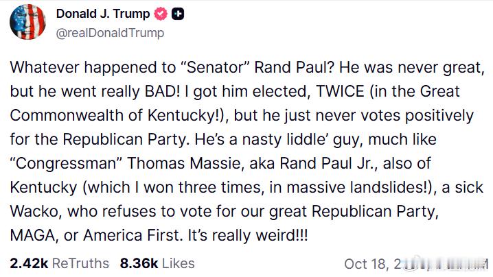 他是个讨厌的小个子,就像国会议员托马斯·马西一样——也就是兰德·保罗二世,同样来自肯塔基(我在那里赢了三次,都是压倒性胜利!)——一个病态的怪人,拒绝为我们伟大的共和党、MAGA运动或‘美国优先’投票。真的太奇怪了!!!”