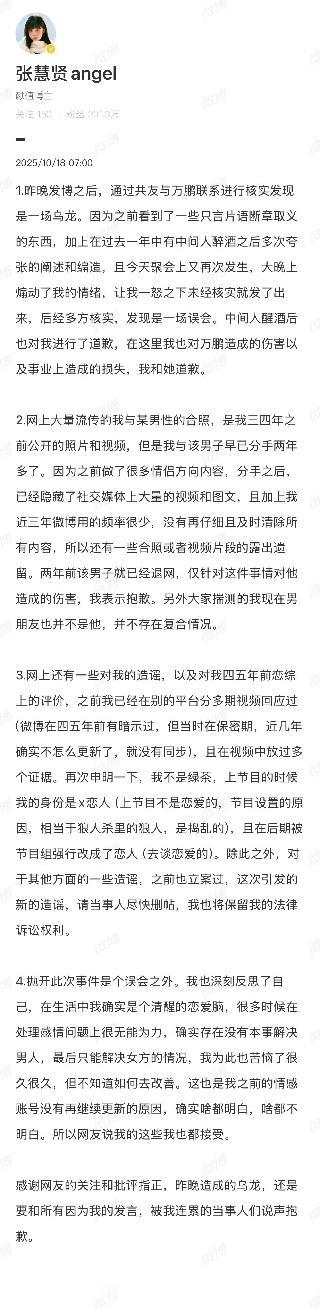 这事儿真是让人看得目瞪口呆。 昨晚张慧贤突然发微博点名万鹏,说人家“当小三当惯了”,结果一觉醒来又发长文道歉,说是被中间人骗了。 可从头到尾,她连张聊天截图都没拿出来,光靠几句话就把人推上风口浪尖。 万鹏这边反应够快,公司直接发声明要追责,本人还换了个懒羊羊翻白眼头像,配文“笑脸给多了,惯的全是病”。 这态度明摆着:不惯着! 网友也火大了,吐槽张慧贤“自己男人问题不解决,专挑女明星碰瓷”,道歉文里还拐弯抹角洗白自己,诚意半点没见着。 要我说,网络不是法外之地,张嘴造谣迟早得付出代价。 万鹏这波硬气维权,倒是给所有人提了个醒:没证据别乱咬,法律专治戏精。