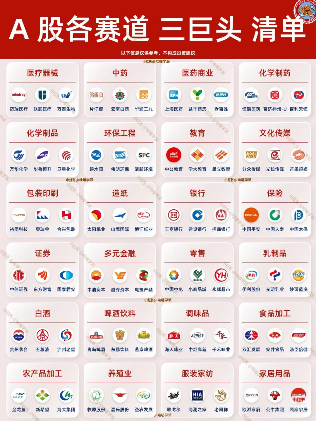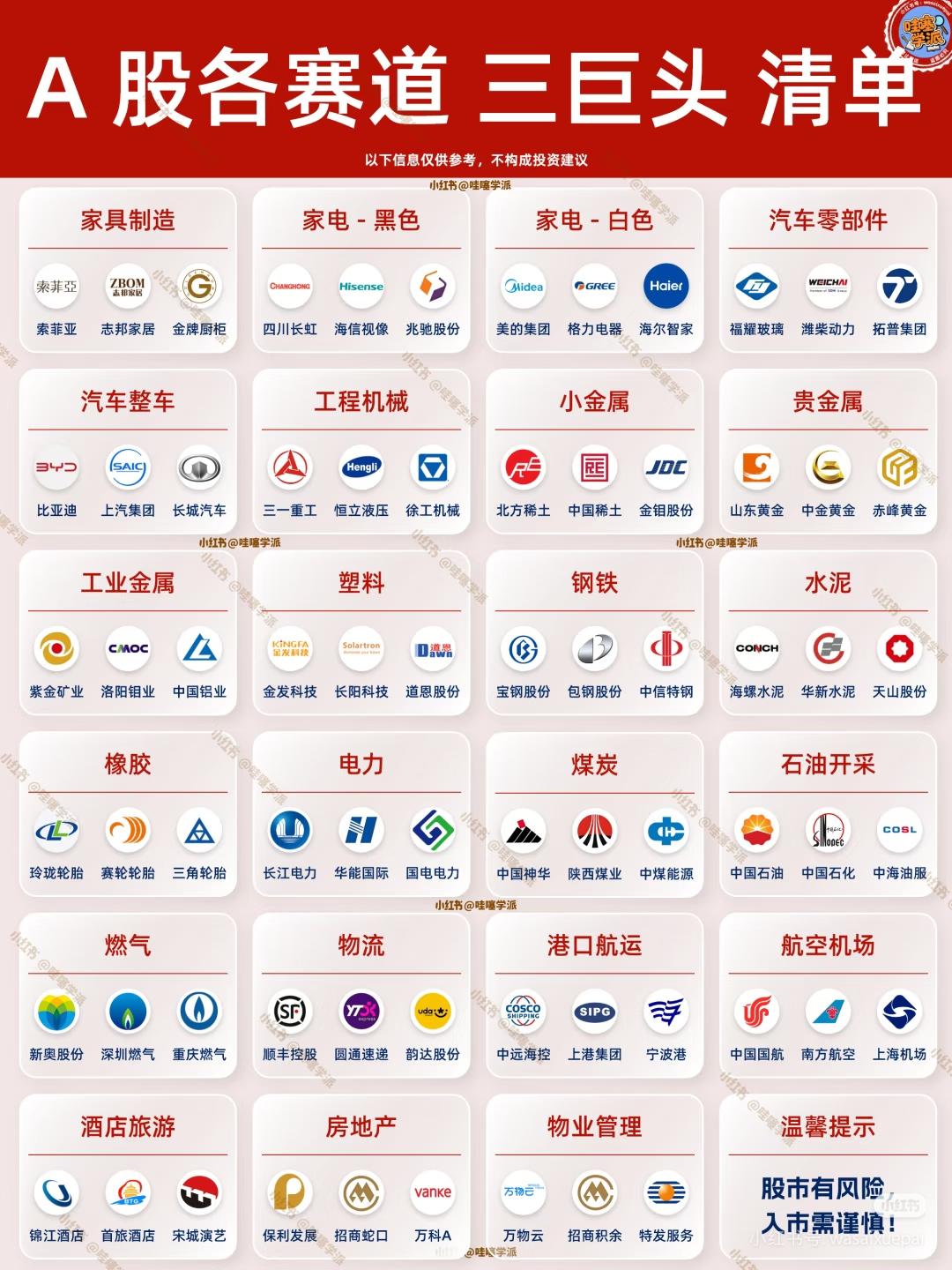 “A股各赛道三巨头清单” 第一张图涵盖范围最广,包括建筑材料(如中材科技、中国巨石、北新建材)、化学原料(如宝丰能源、君正集团、龙佰集团)、工业母机(如创世纪、秦川机床、华工科技)、军工装备(如CSSC、中航沈飞、中国船舶)、专用设备(如中集集团、巨星科技、利欧股份等)、核电设备(如中国核电、中国广核、东方电气等)、电网设备(如国电南瑞、思源电气、正泰电器)、人工智能(如科大讯飞、寒武纪-U、海康威视等)、储能设备(如阳光电源、科华数据、上能电气等)、通信设备(如中兴通讯、中天科技、中国联通等)、工业富联、消费电子、IT服务(如紫光股份、宝信软件、软通动力)、游戏(如三七互娱、完美世界、世纪华通)、电池(如宁德时代、亿纬锂能、国轩高科)、半导体(如中芯国际、北方华创、豪威集团)、电子元件(如京东方A、TCL科技、三安光电)以及光学光电子、医疗器械(如爱尔眼科、泰格医药等)等多个细分领域,每个领域下均列出三家代表性企业。 第二张图同样聚焦于A股各行业三巨头,展示的赛道包括医疗器械(如迈瑞医疗、联影医疗、万泰生物)、中药、医药商业(如上海医药、益丰药房、老百姓)、化学制药等,各赛道以独立区块呈现,公司名称旁配有丰富色彩的品牌标识,便于快速识别不同行业的龙头公司,但部分区域文字存在一定重叠或混乱(如出现“中公教育”“分众传媒”“光线传媒”等非医药类企业名称,可能是图片内容排版或截取问题)。 第三张图背景为浅粉色,风格较为简洁,除标题外底部特别提示“股市有风险,入市需谨慎!”。内容聚焦20个具体行业(如家具制造、家电-黑色、家电-白色等),每个行业下列举三家代表企业并配有相应品牌标志,例如家具制造领域为索菲亚、志邦家居、金牌厨柜;家电领域包含美的集团、格力电器、海尔智家等,覆盖消费、制造等民生相关板块,直观呈现各细分市场的头部企业。