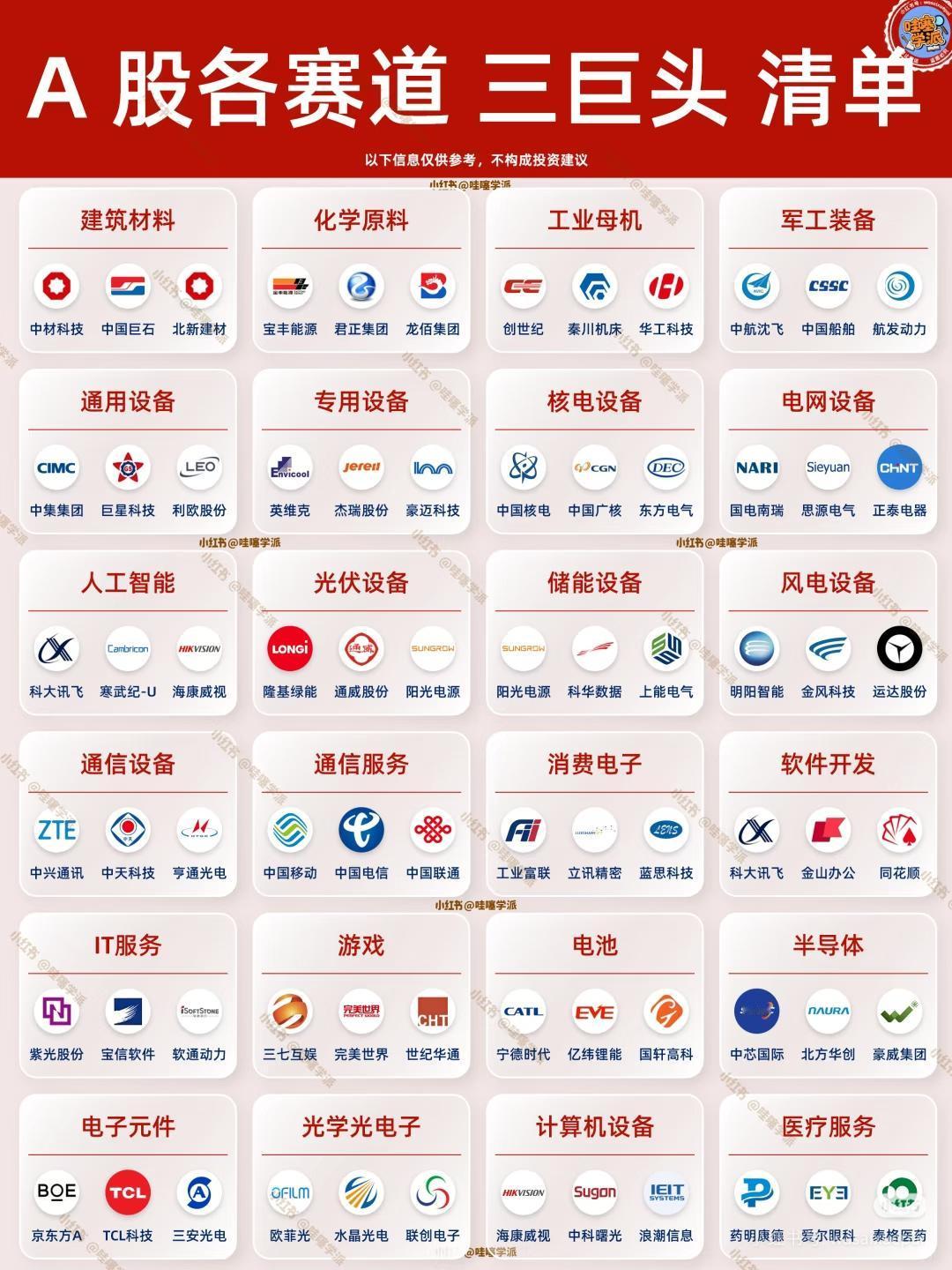 “A股各赛道三巨头清单” 第一张图涵盖范围最广,包括建筑材料(如中材科技、中国