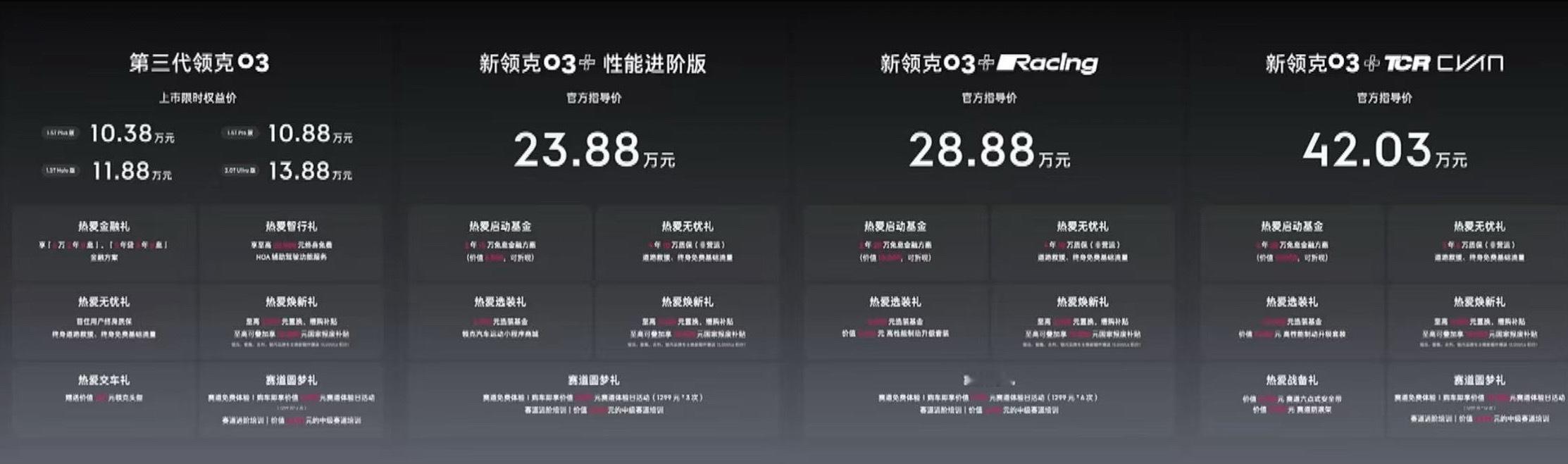 特别是领克03基础版给出10.38万到13.88万的价格,从1.5T到2.0T四个版本覆盖不同预算,这种“性能平权”太关键了。要知道,十几年前我们想找台靠谱的性能车,要么花大价钱买进口车,要么只能接受合资车的减配版。而领克用“六年七冠”的实力做背书,用接地气的价格和实在的权益,让性能不再是少数人的特权。