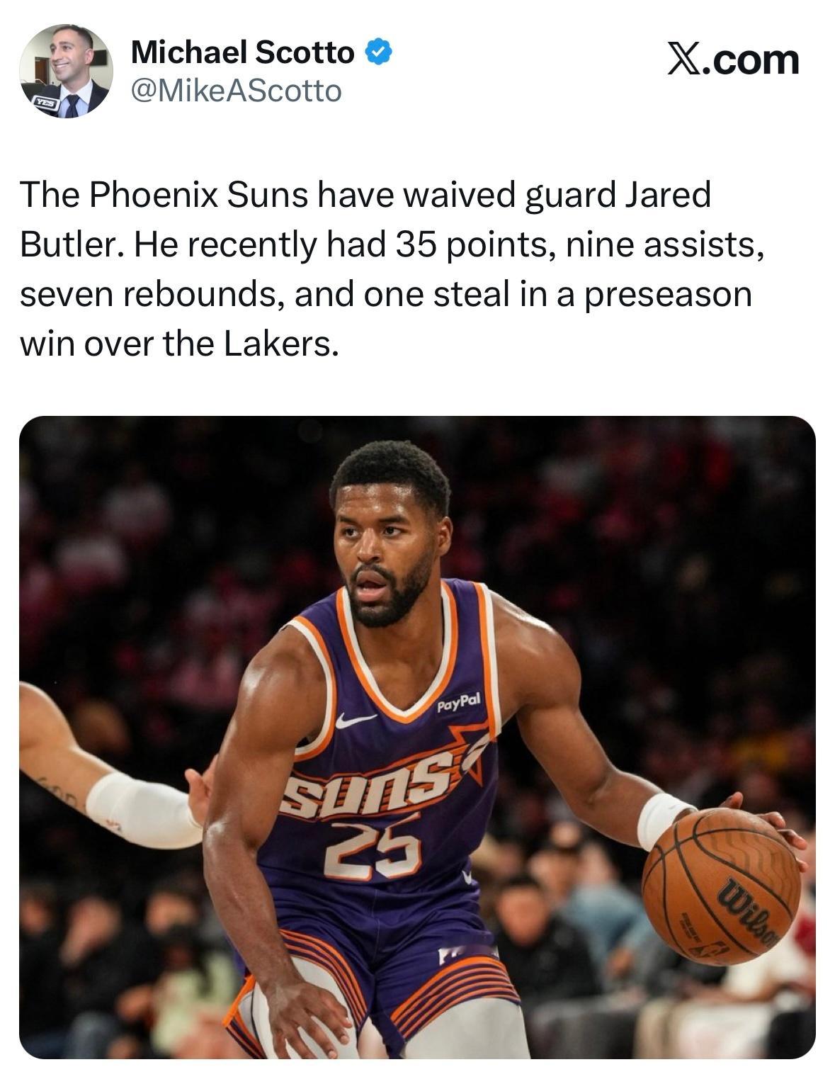 太阳裁掉后卫贾里德·巴特勒。他在近期一场季前赛战胜湖人队的比赛中,砍下35分、9次助攻、7个篮板和1次抢断。