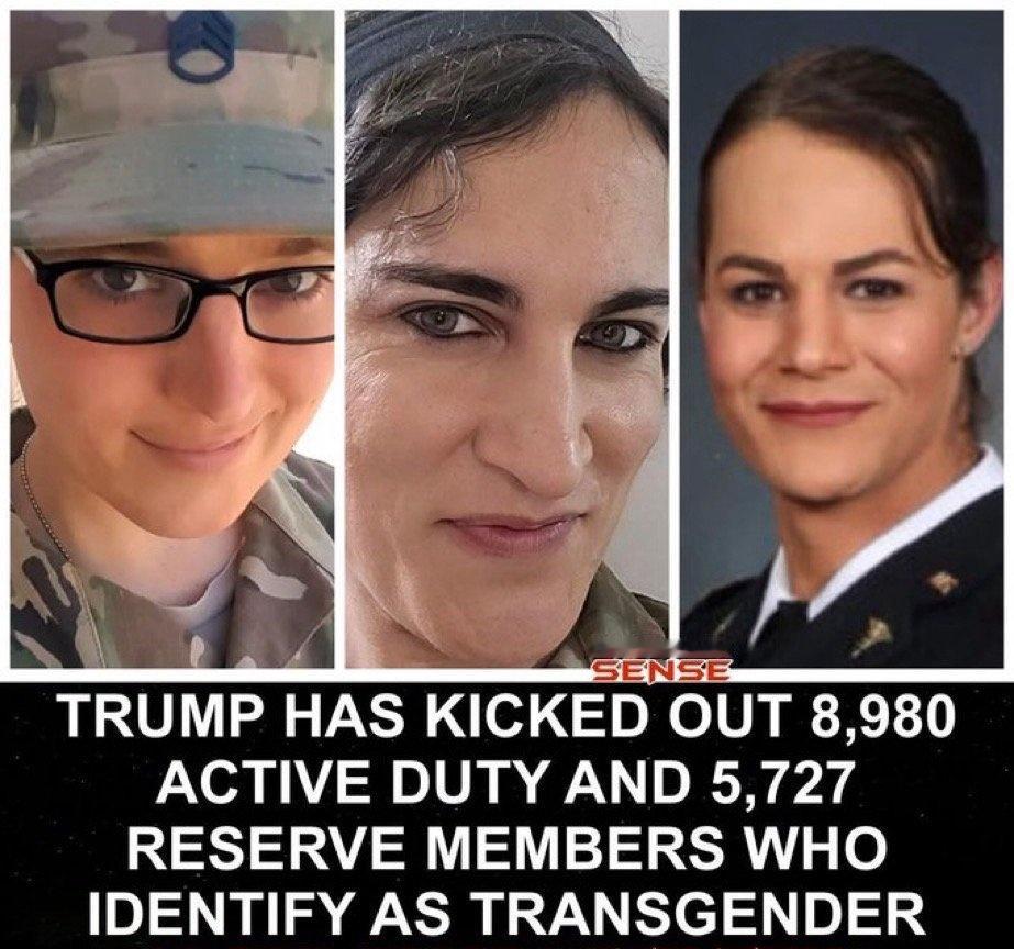 美媒:Trump 如今已开除了8980 名变性的现役军人,以及 5727名变性的后备军人。 这个数据让我有点小吃惊。没想到在最需要勇气和阳刚精神的军队,竟然有这么多变性人。要知道,变性人是要终身服药的,还有各种心理问题、后遗症和并发症。这帮人能有血性?能保家卫国? 想不明白拜登(当然,幕后是奥巴马)为什么把军队的大门也向变性人敞开,更荒唐的是还有 DEI办公室为其提供各种心理生理辅导,政府还出资为变性人做手术。 除了变性人,更别提大量的肥胖军人和因“肤色正确”被提拔的将领了。怪不得美军这几年这么拉胯,怪不得这几年世界战乱纷起。 军队尚且如此,其他各行各业的变性人、DEI 的泛滥程度,可想而知。川大爷,在这点上,我支持你!