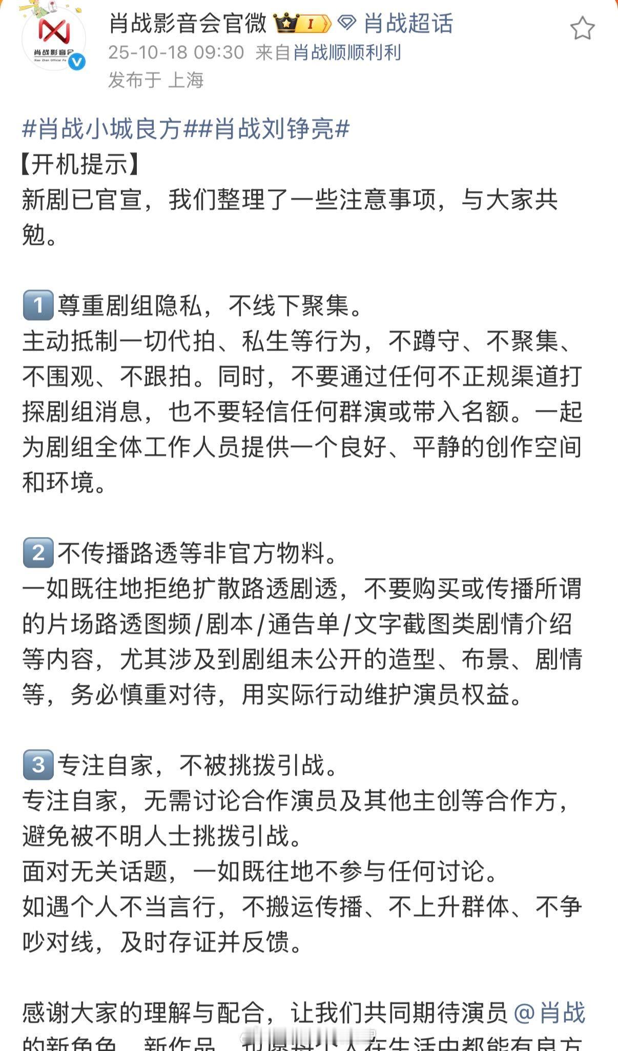 小城良方《小城良方》官宣开机,肖战无缝进组,粉丝影音会回也贴心准备了一些剧拍摄期间的注意事项,很正向粉圈氛围。期待刘博士在东北小城的故事