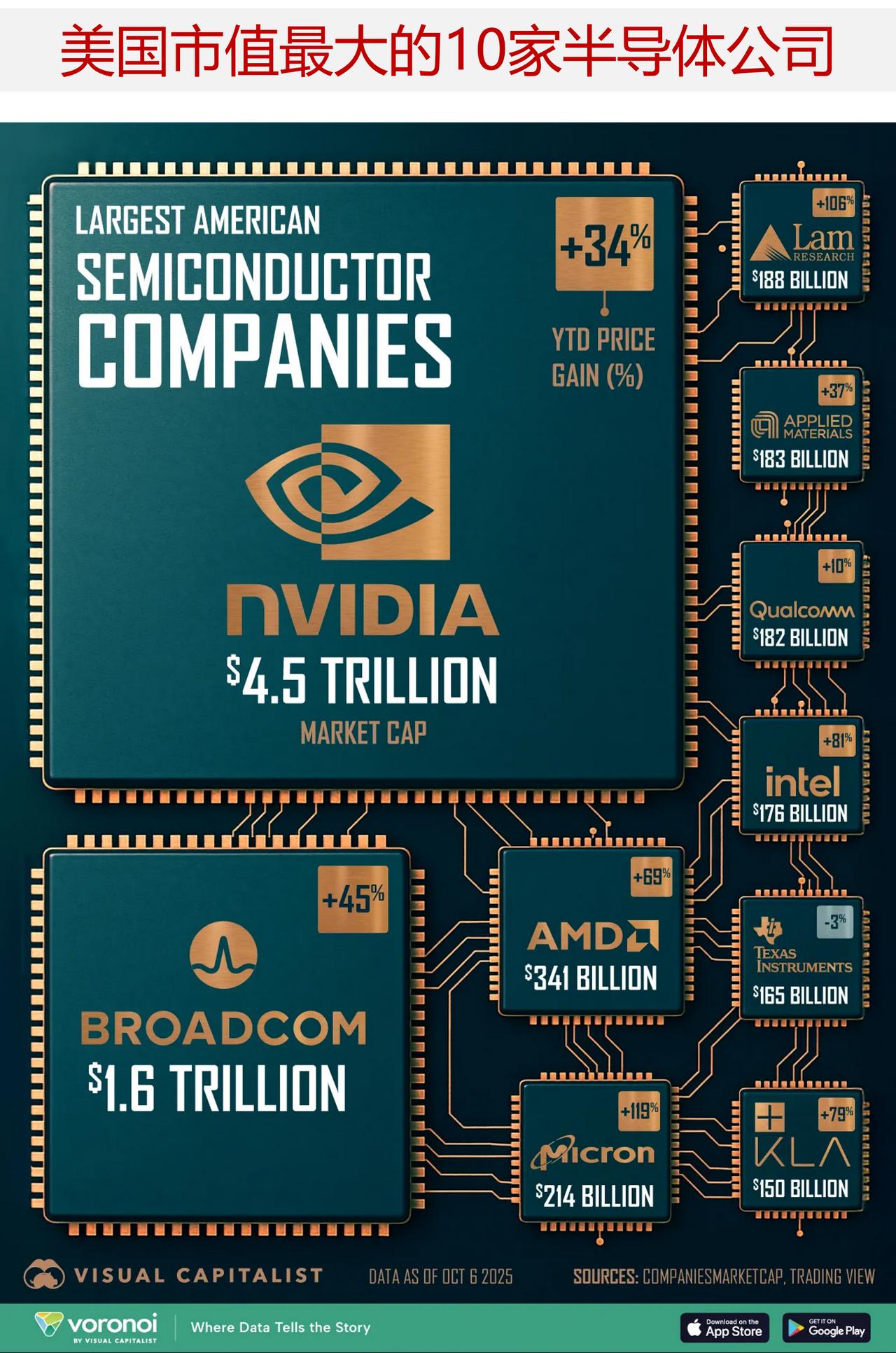 一图展示按市值排名的美国前十大半导体公司 英伟达在半导体行业仍占据主导地位,其市值几乎是其美国主要竞争对手的三倍之多。 但这场竞争正在迅速升温。OpenAI 最近与 AMD 达成了价值数十亿美元的合作协议,其中包括计划为其数据中心采购数万块芯片——这一举措使得 AMD 的股价大幅上涨,并预示着人工智能硬件领域的格局可能发生变化。 下面图表展示了2025 年 10 月 6 日美国主要芯片制造商的市值情况,数据来源于“CompaniesMarketCap”网站。 目前,英伟达的市值接近 4.6 万亿美元,其股价今年迄今已上涨了 34%。 大型云服务提供商(可能是亚马逊、谷歌和微软)占据了其数据中心总收入的 50%。在其最新的财报中,“客户 A”占其总收入的 23%,而“客户 B”则占 16%——这表明其客户群体高度集中。 博通公司的市值达 1.6 万亿美元,是第二大企业。该公司以生产专用芯片而闻名,其客户包括 OpenAI 等公司。 排名第三的是 AMD 公司,其生产的芯片价格比英伟达的更低。该公司还战略性地将重点放在了用于推理任务的芯片上——这类芯片用于运行人工智能模型而非进行模型训练。 值得注意的是,随着人工智能基础设施的不断扩大,这类解决方案的市场需求预计将会持续增长。截至今年年初,AMD 的股价已上涨 69%——涨幅几乎是英伟达的两倍。
