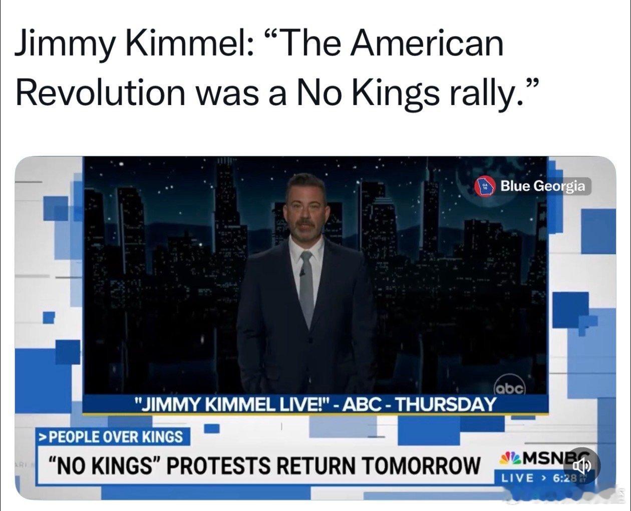 Jimmy Kimmel: 参加“No Kings”抗议是不爱国?没有比这更爱国的了!美国人的革命就是从“我们不要国王”运动开始的❌👑