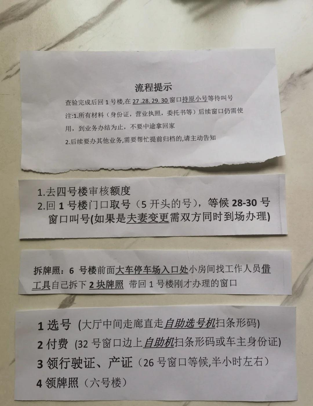外牌转沪牌,三分所(康桥)自办流程攻略 【提交转籍申请】:在“交管12123”APP上发起“机动车转籍申请”,打开APP—更多—机动车转籍申请。(预计3个工作日,可以在APP网办进度进行查询,只要办理进度为“转入地预受理成功”即可。 【预约上牌时间】:登录“随申办”APP,搜索“上海交警”选择“车驾管业务预约“中的“外省市机动车转入”预约现场办理的时间。 现场办理材料(都是原件) 1、身份证; 2、行驶证; 3、额度单; 4、机动车登记证书; 现场办理流程:(以下窗口流程三分所适用) 1️⃣6号楼车辆拓印:进入三分所车子右转然后跟着道路到6号楼进行车辆拓印,拿好拓印条; 2️⃣1号楼取号到窗口办理:提交相关材料,窗口会给你验车材料; 3️⃣1号楼出门左转再左转到楼后方进行车辆检验;(注意验车前不要拆旧牌) 4️⃣车辆检验好之后持原办理号码小票回到1号楼窗口等待叫号办理后续业务; 5️⃣4号楼办理额度单审核业务; 6️⃣回到1号楼取号(5开头的号),窗口等待办理沪牌业务; 7️⃣办理好后车辆开到6号楼前面大停车场入口处小房间,找工作人员借工具自行拆下牌照,带回1号楼交给刚才办理的窗口; 8️⃣选号(大厅中间走廊直走自助选号机扫条形码)缴费110元(32号窗口边上自助机扫条形码或车主身份证)完成后等待领取行驶证、机动车登记证(26号窗口等候,半小时左右) 9️⃣拿到行驶证、机动车登记证后,开车到6号楼领新牌安装车牌。 周四下午1点到,3点结束。 谢谢你看完我这篇分享[谢谢] 车牌 沪牌上牌 外牌转沪
