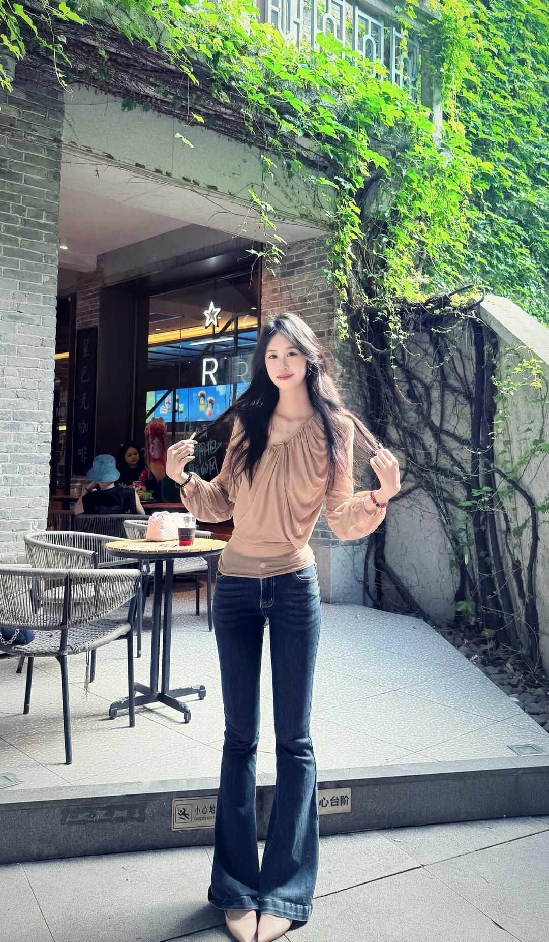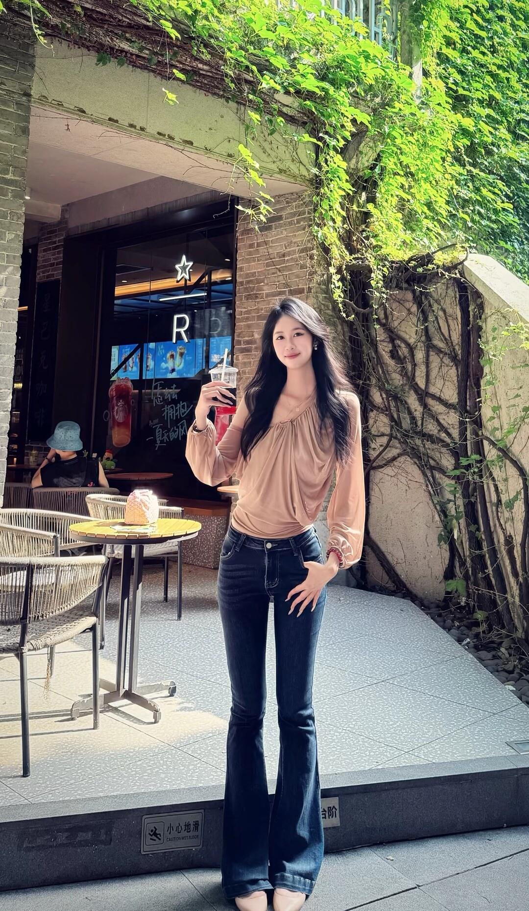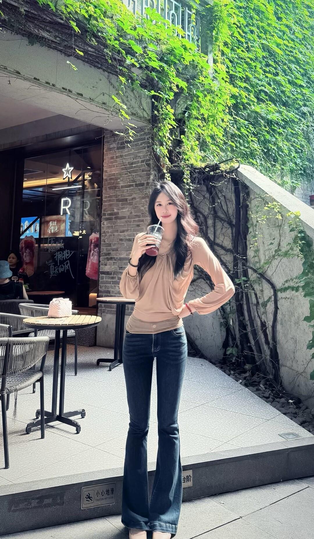绿植环绕的复古咖啡馆,时尚穿搭与自然美景的完美结合。