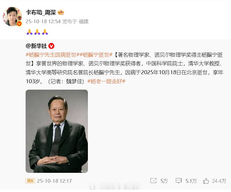 周深悼念杨振宁 18日,杨振宁逝世,周深发博悼念:“🙏🙏🙏”