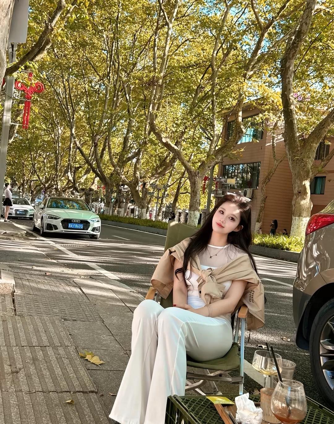 都市女孩的悠闲时光,坐在路边享受宁静。
