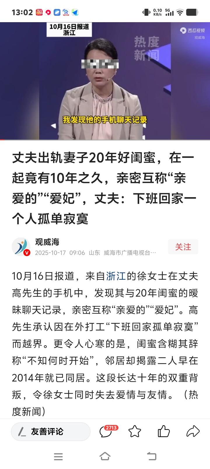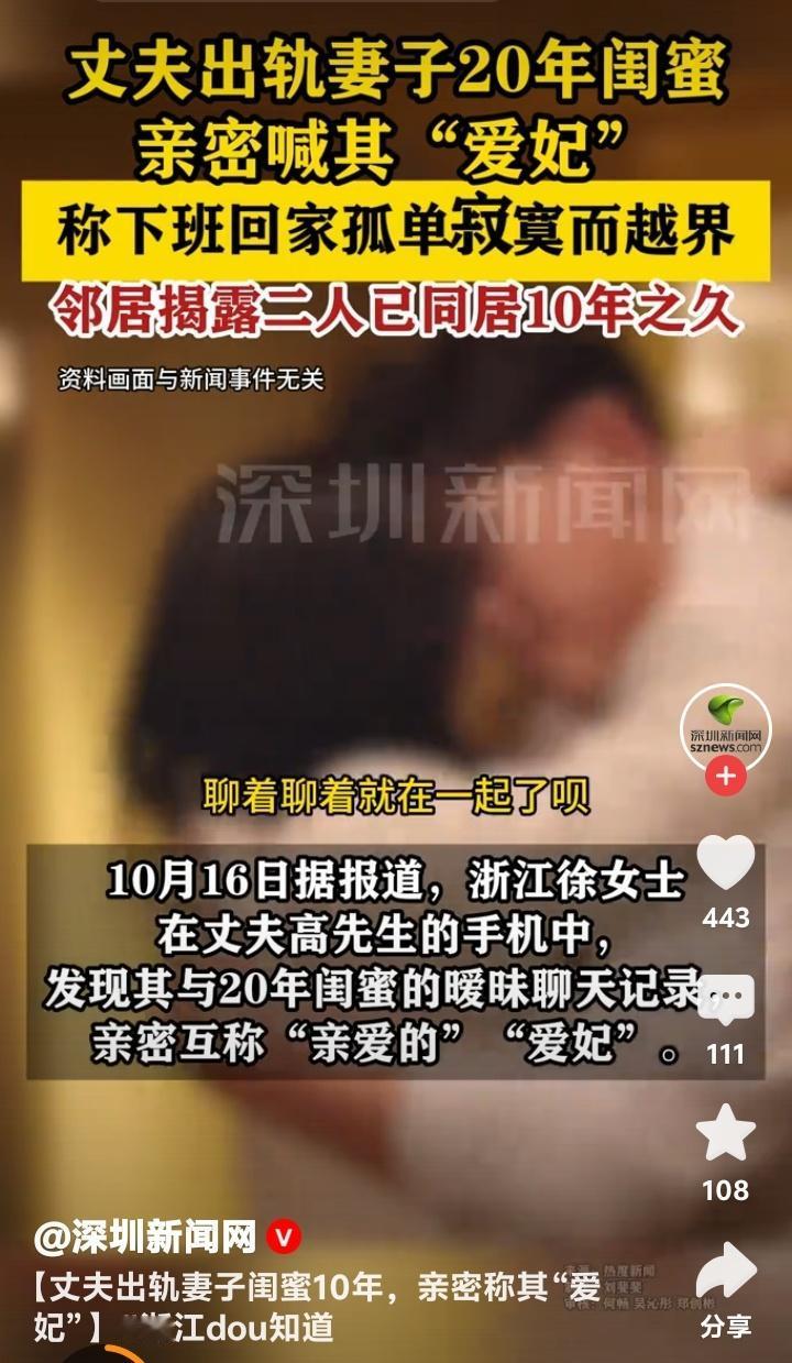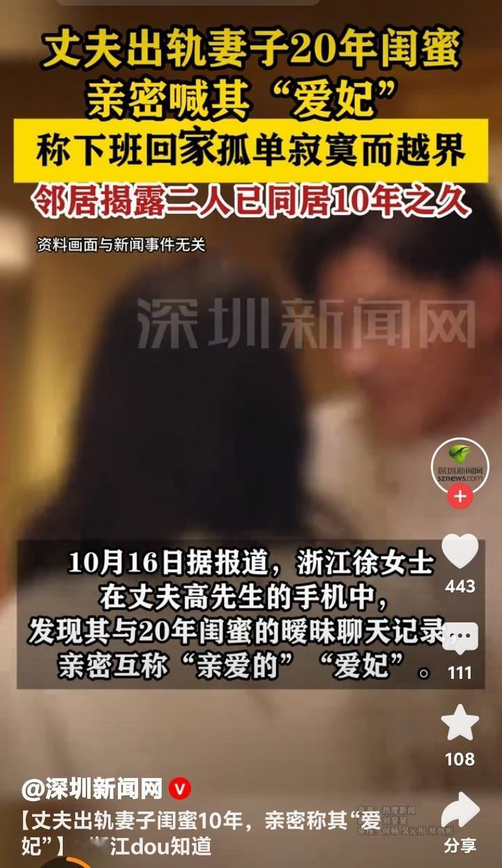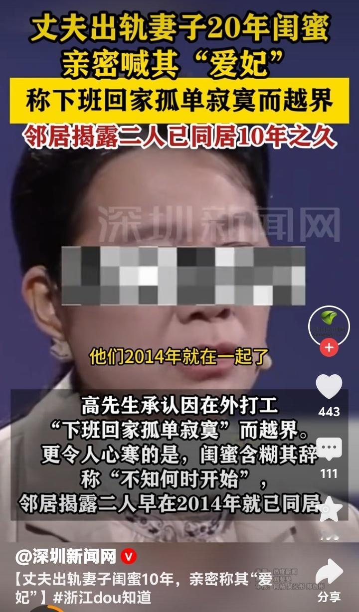 浙江女子惊觉丈夫出轨20年闺蜜十年隐秘情史,邻居揭露“爱妃”同居真相引爆全网愤慨 (来源:观威海、深圳新闻网综合报道) 徐女士的世界在翻开丈夫手机的那一刻彻底崩塌。聊天记录里,“亲爱的”“爱妃”等亲昵称呼刺眼地跳跃着,而发送这些消息的竟是与她相识二十年的闺蜜。丈夫高先生轻描淡写地解释:“下班回家一个人孤单寂寞”,却掩盖不了这场长达十年的双重背叛。更讽刺的是,邻居冷冰冰的证词撕碎了最后一丝伪装:“他们2014年就在一起了。” 二十年的友情,十年的婚姻,竟在暗处早已腐烂。徐女士的遭遇瞬间戳中了无数人的痛点——那些看似坚不可摧的关系,是否也藏着不为人知的裂缝?网友评论一针见血:“防火防盗防闺蜜,原来不是玩笑。”当最信任的人成为捅刀最狠的人,这种背叛感足以摧毁一个人对人性最后的期待。 高先生的“孤单寂寞”说辞,暴露了婚姻中常见的逃避心态。许多人在平淡生活中试图寻找刺激,却忘了责任二字的分量。心理学家分析,这种长期隐瞒的出轨往往源于自私的欲望,而非真正的感情需求。更可悲的是,闺蜜含糊其辞的“不知何时开始”,仿佛在嘲笑徐女士二十年的真心付出。 邻居的揭露让这场背叛显得更加残忍。十年间,徐女士或许曾与闺蜜分享家庭琐事,甚至倾诉婚姻困惑,而对方却戴着面具参与她的生活。这种“影子关系”让人不寒而栗:我们身边是否也有人一边扮演知己,一边蚕食我们的幸福? 事件曝光后,网友们的愤怒如潮水般涌来。有人痛斥:“寂寞不是背叛的借口,而是人性的试金石。”也有人反思:“婚姻需要双方共同经营,但忠诚是底线。”徐女士的遭遇之所以引发共鸣,是因为它触及了现代人际关系中的脆弱性——我们渴望亲密,却又害怕被最亲近的人背叛。 这场悲剧的背后,是当代婚姻面临的普遍困境:快节奏生活中,情感交流的缺失让一些人选择向外寻求慰藉。但真正的解决之道,从来不是逃避或欺骗,而是直面问题、修复关系。正如一位情感导师所言:“寂寞是婚姻的警报,而非出轨的通行证。” 徐女士的故事尚未结局,但她的勇气已点燃了公众对诚信与责任的讨论。每一条评论、每一次转发,都是对背叛者的无声谴责和对受害者的声援。或许,这场舆论风暴能唤醒更多人对婚姻的敬畏之心。 浙江 女子惊觉丈夫出轨闺蜜20年 婚姻背叛 友情危机人性真相 (本文综合自观威海、深圳新闻网等权威报道,细节源自当事人陈述及邻居证言)