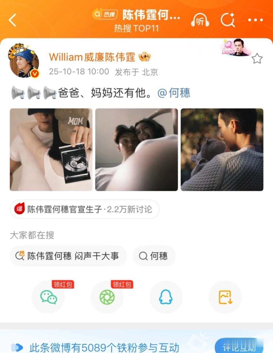 陈伟霆何穗官宣生子!!!! 给我一种毫无关联和cp感的人在一起并且还生娃了的