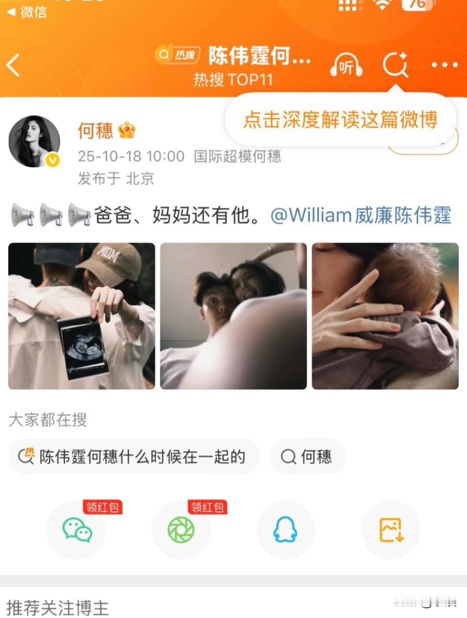 陈伟霆 何穗官宣生子!!!! 给我一种毫无关联和cp感的人在一起并且还生娃了的震惊感[吃瓜群众] 以前只是有爆出他俩的绯闻 然后热度也不咋高 中间好像也传过分手 没爆出领证结婚啥的仪式突然就有娃了。[吃瓜群众]我还沉浸在 妍妍你接电话啊 陈伟霆