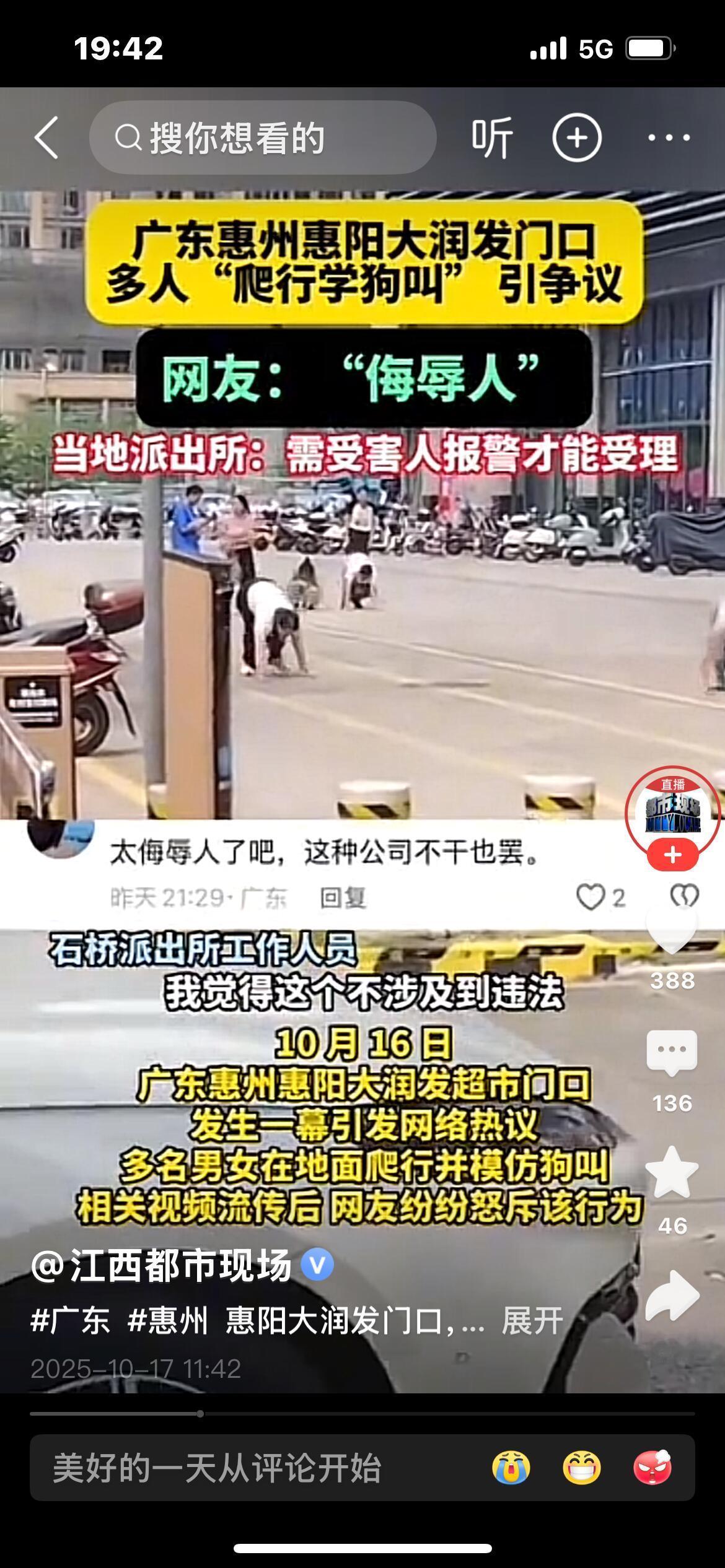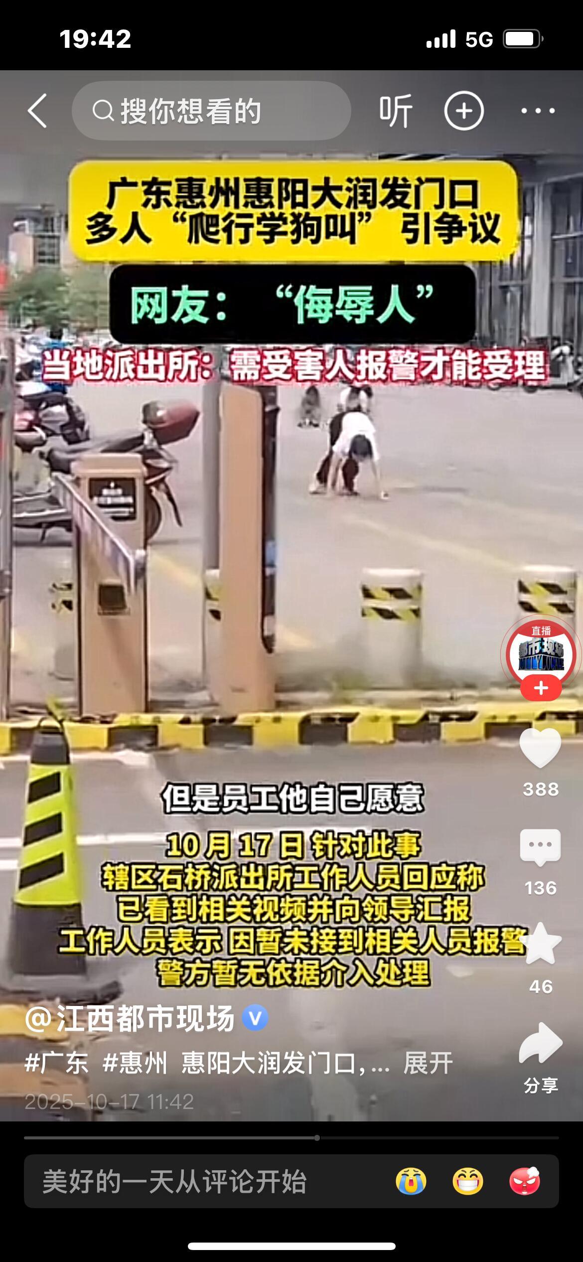 听说了吗?广东惠州那事儿,街上好几个人爬着学狗叫,说是某教育公司搞的“突破自我”团建。真给我看傻了。 这些年,这种打着团建名义糟践人的事就没停过。现在我一看见“团建”俩字就心里发毛。什么突破自我?不就是逼人突破做人的底线当狗吗?还美其名曰“激励”,老板自己怎么不带头爬两圈叫两声? 打工人平时自嘲“牛马”已经够心酸了,活儿干得比谁都累,结果某些老板还嫌不够,非要把人驯成“听话的狗”。说白了,这就是权力膨胀——当众踩碎你的尊严,让你觉得丢人,以后就更不敢反抗了。 法律明明写着不能侮辱劳动者,人格尊严不容侵犯。可这种事为啥还老有?一来公司总拿“自愿”“团建”当借口,二来大家为了饭碗不得不忍。 所谓的“突破自我”,根本就是职场PUA的遮羞布。把办公室变成弱肉强食的丛林,把员工当宠物驯——业绩好就是忠诚,不听话就收拾你。 当团建变成侮辱,管理变成霸凌,我们能只怪员工不敢反抗吗?是不是更该问问:有些公司的管理,到底病成什么样了? (欢迎一起聊聊你的看法)我们不是牛马我们是人 惠州街头现多人学狗爬行 当代牛马青年