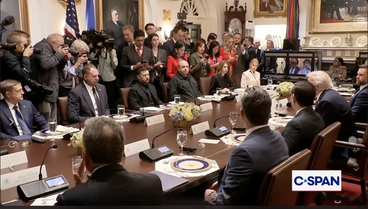 被慢待……泽连斯基这次访问白宫,川普好像降低了他的待遇。首先只是是派了两个低级别官员去迎接,没有美国仪仗队,没有仪式,什么都没有。为了挽回面子,他不得不自己上演一场“欢迎”,让他的随行人员迎接他,包括驾驶飞机带他来这里的飞行员...... 然后在会晤时没有在椭圆会议室举行元首对等位置的会谈,而是把泽连斯基放在一堆阁员中间,按照内阁开会的方式去接接待连斯基;最后川普还让泽连斯基等了好一会儿,因为他要去接待男高音歌唱家安德烈·波切利。 媒体提问也在给泽连斯基挖坑:你怎么看待川普和拜登在外交政策上的差别? 泽连斯基很聪明的回答了这个问题:拜登现在不是美国总统,没有机会结束这场战争;川普现在是美国总统,他现在有机会结束战争,希望他能像结束中东战争 一样结束乌克兰战争。 川普对此回答还是不满意,自己回答:"我得说,那是因为我非常有能力。而另一位,简直是无能透顶。."