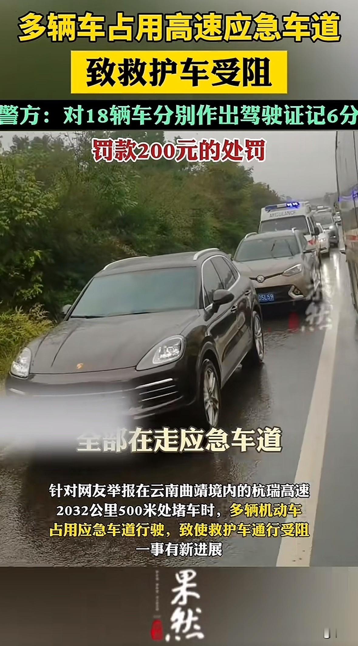 10月7日,云南曲靖杭瑞高速堵车,多辆私家车占了应急车道,鸣笛的救护车被堵得过不去。10月18日,交警查实18辆车违法,都罚了200元、记6分。 应急车道是“生命通道”,专供救护车这些紧急车辆用的。堵车时图自己方便占道,看似省点时间,实则可能耽误别人救命。之前有地方救护车被堵,医护人员得徒步去救援,还有人因此没得到及时救治离世。 法律早有规定,非紧急情况占道就是违法,罚钱扣分没商量。别觉得罚得重,比起生命,这点处罚算轻的。希望司机们都能记牢,不占应急车道,既是守规矩,也是给别人留生机。