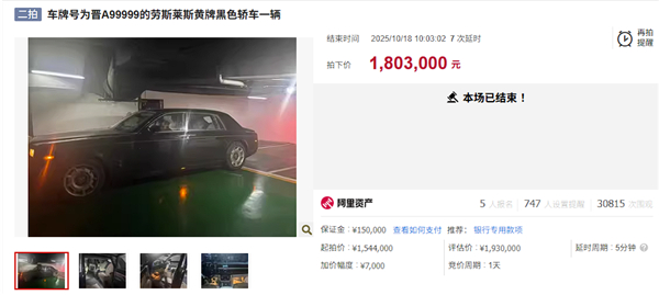 晋A99999劳斯莱斯加长幻影成功拍卖【打八折 晋A99999劳斯莱斯加长幻影180万成功拍卖:不含牌照】快科技10月18日消息,今日,一辆车牌号为晋A99999劳斯莱斯黄牌黑色轿车,经过激烈的拍卖,最终以180.3万元的价格成功易主。