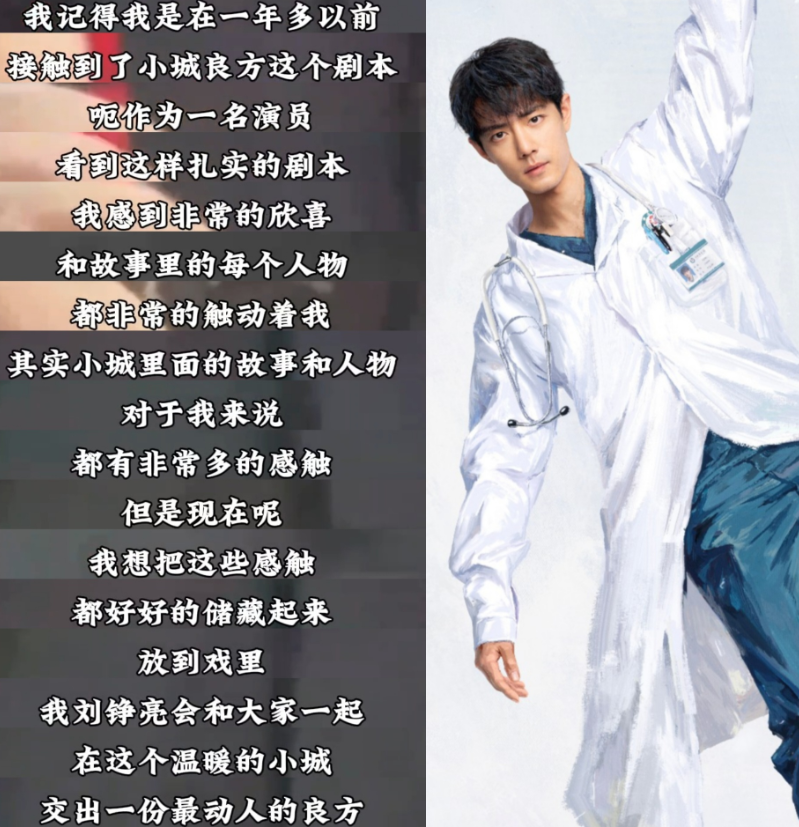 对肖战来说,一年以前就收到了小城良方的剧本,在飞机上一气读完,感觉剧本扎实,故事与人物有很多触动到他的地方,于是欣然赴约,坚定地选择出演。 . 对剧方来说,肖战是刘铮亮的不二人选,因为他既有稳定强大的内核,又有一点破碎感的外在,非常符合角色定位。 . 对作为观众的我来说,我永远信任肖战的选择,因为他审美比我高级,以上!