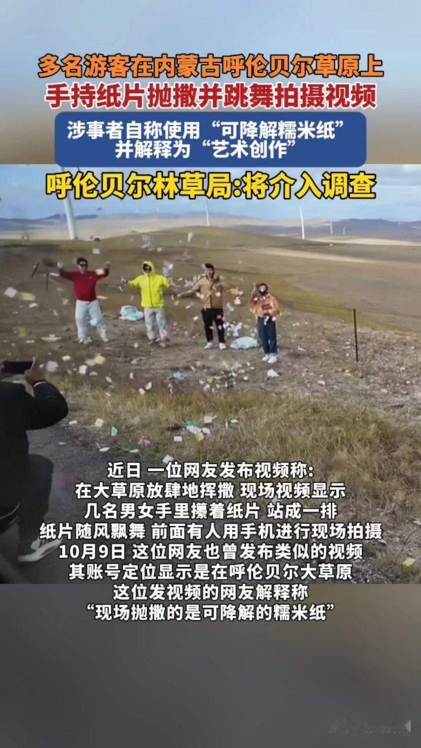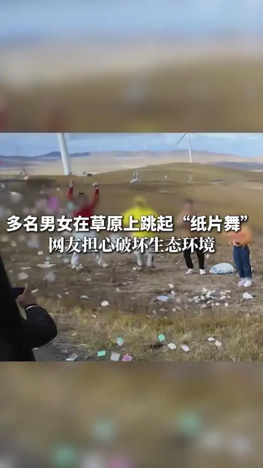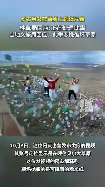 10月15日,有网友发布视频,画面中几名男女在呼伦贝尔大草原上跳起“纸片舞”,肆意挥洒纸片,现场一片狼藉。此事登上热搜后引发争议,不少网友质疑该行为会破坏生态环境。尽管发视频的网友解释称撒的是可降解的糯米纸,但“降解”所需时间并不明确,且五彩斑斓的纸屑破坏了草原的美感。 近年来,呼伦贝尔草原游客乱扔垃圾等不文明现象屡见不鲜。此次“纸片舞”事件,即便所撒纸张能够降解,这种行为也已突破文明底线,还可能引发他人效仿。希望大家能够自觉保护草原环境,不要再有此类“撒野”之举。 纸片飞起来 纸片纷飞名场面 纸舞蹈
