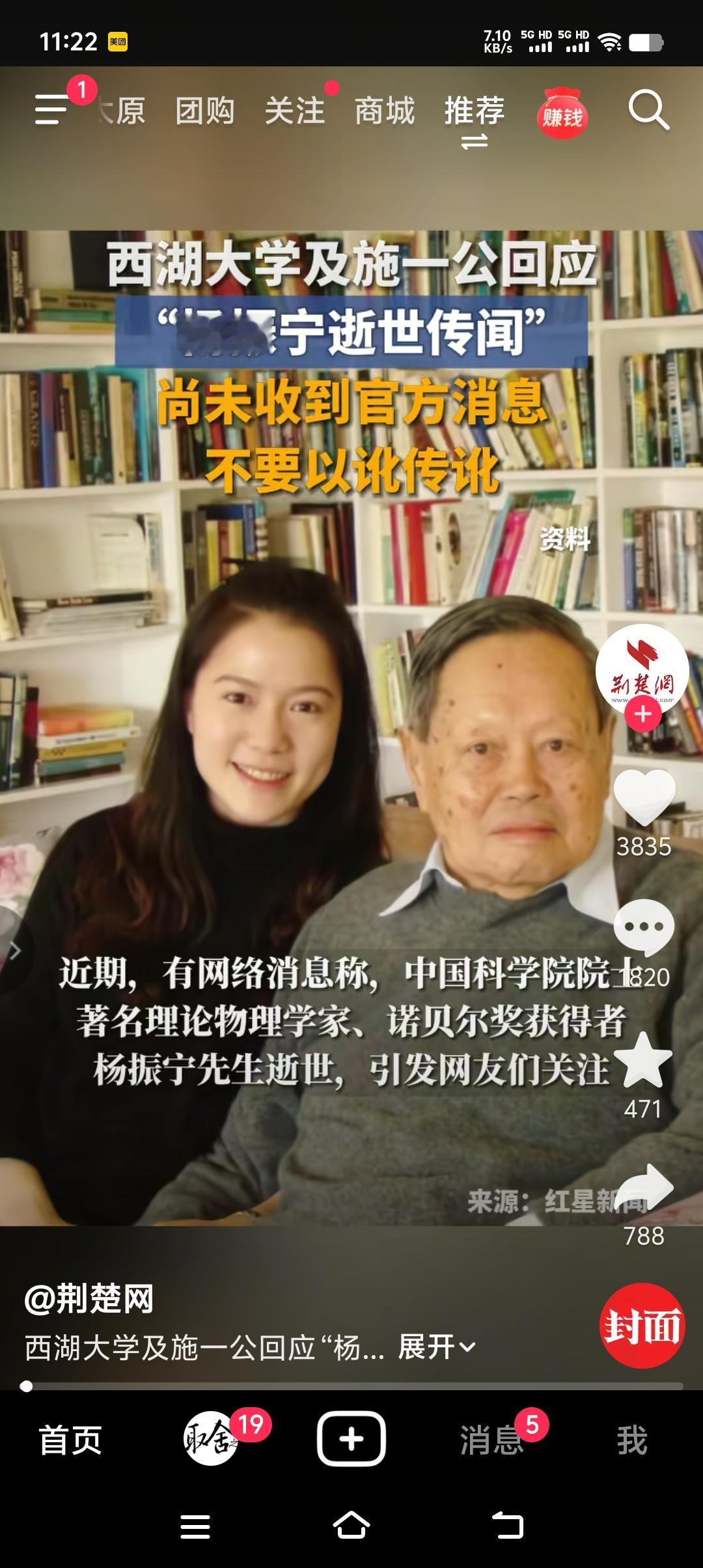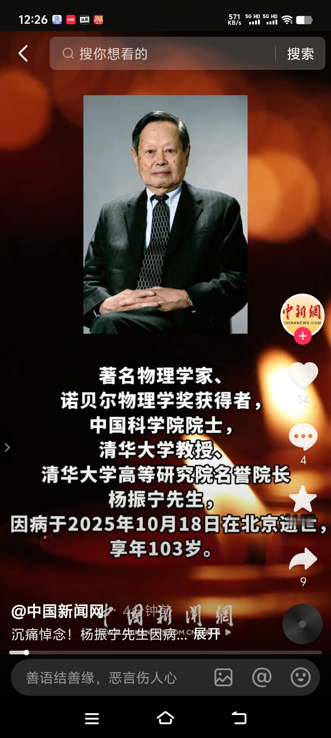 网传杨振宁先生逝世,西湖大学施一公为此辟谣,不要以讹传讹。今天官方宣布杨振宁在北