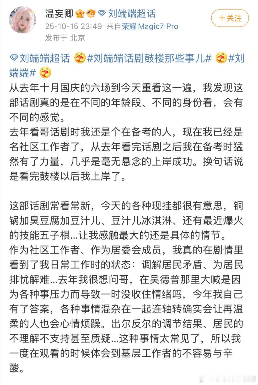 粉丝受刘端端鼓励考公上岸刘端端超棒!演《鼓楼那些事儿》时沉心琢磨角色传递力量,粉