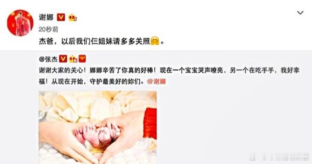 张杰:“现在⼀个宝宝哭声嘹亮,另⼀个在吃⼿⼿,我好幸福!从现在开始,守护最美好的你们。娜娜⾟苦了,你真的好棒!”