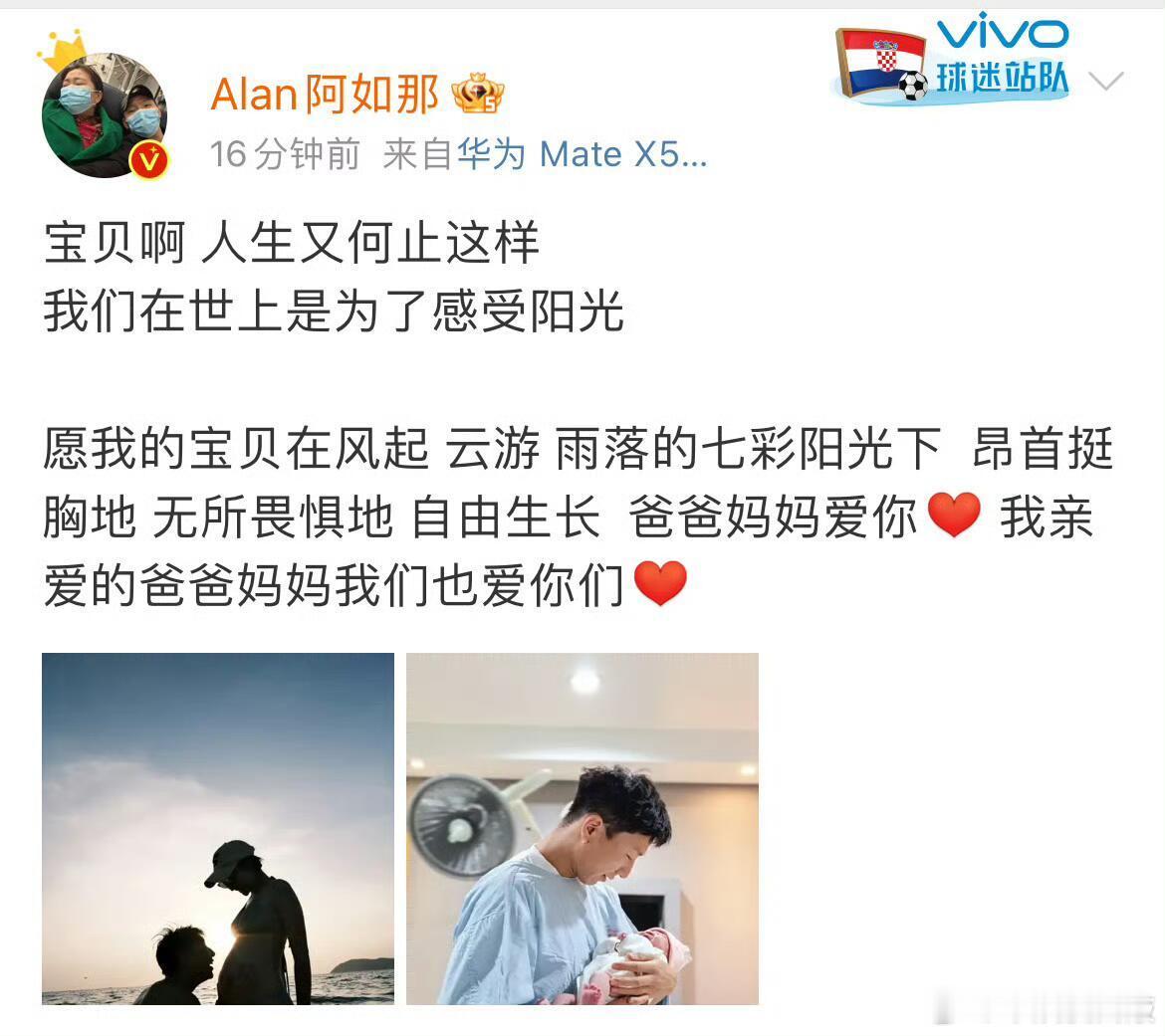 “宝贝啊 人生又何止这样,我们在世上是为了感受阳光,愿我的宝贝在风起 云游 雨落的七彩阳光下,昂首挺胸地 无所畏惧地 自由生长。爸爸妈妈爱你 我亲爱的爸爸妈妈我们也爱你们 ”