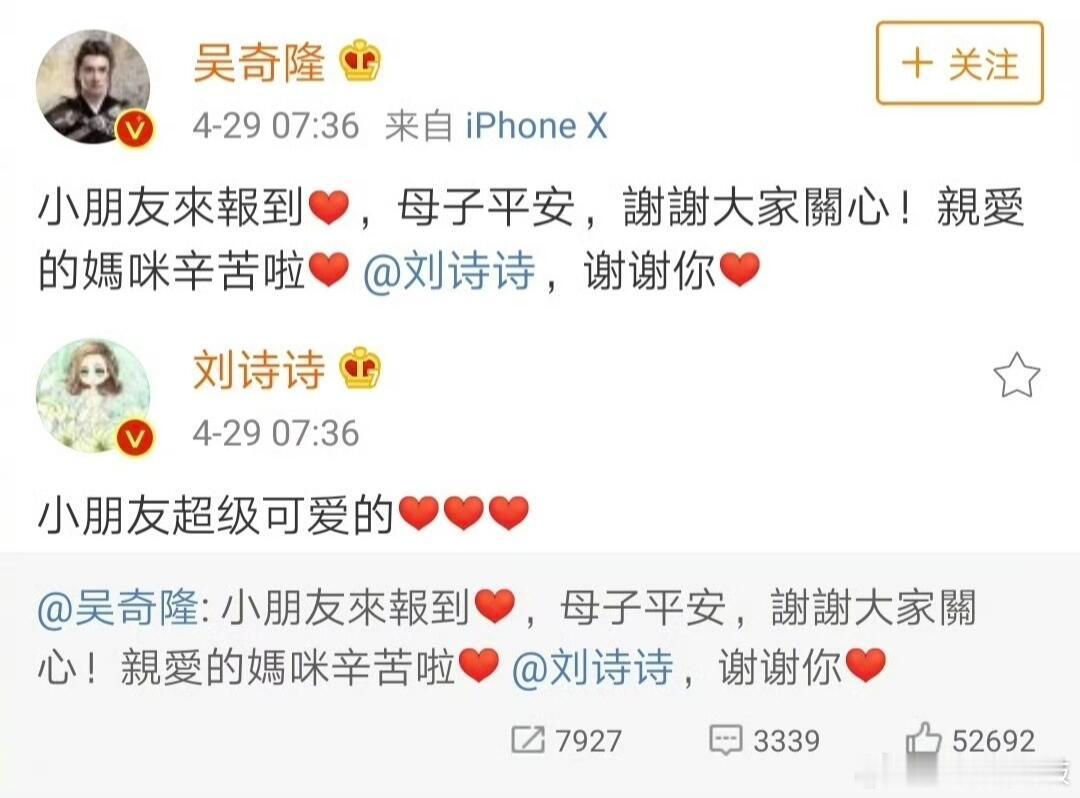 “小朋友來報到,母子平安,謝謝大家關心!親愛的媽咪辛苦啦,刘诗诗”