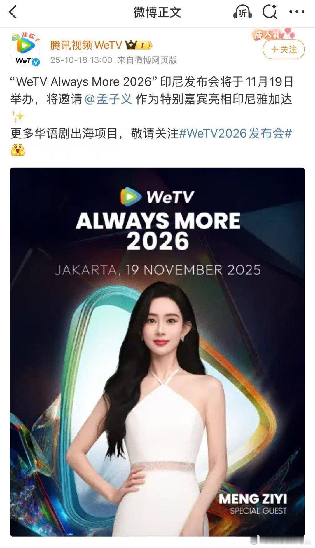 孟子义wetv2026发布会孟子义官宣出席WeTV2026印尼发布会,海外新身