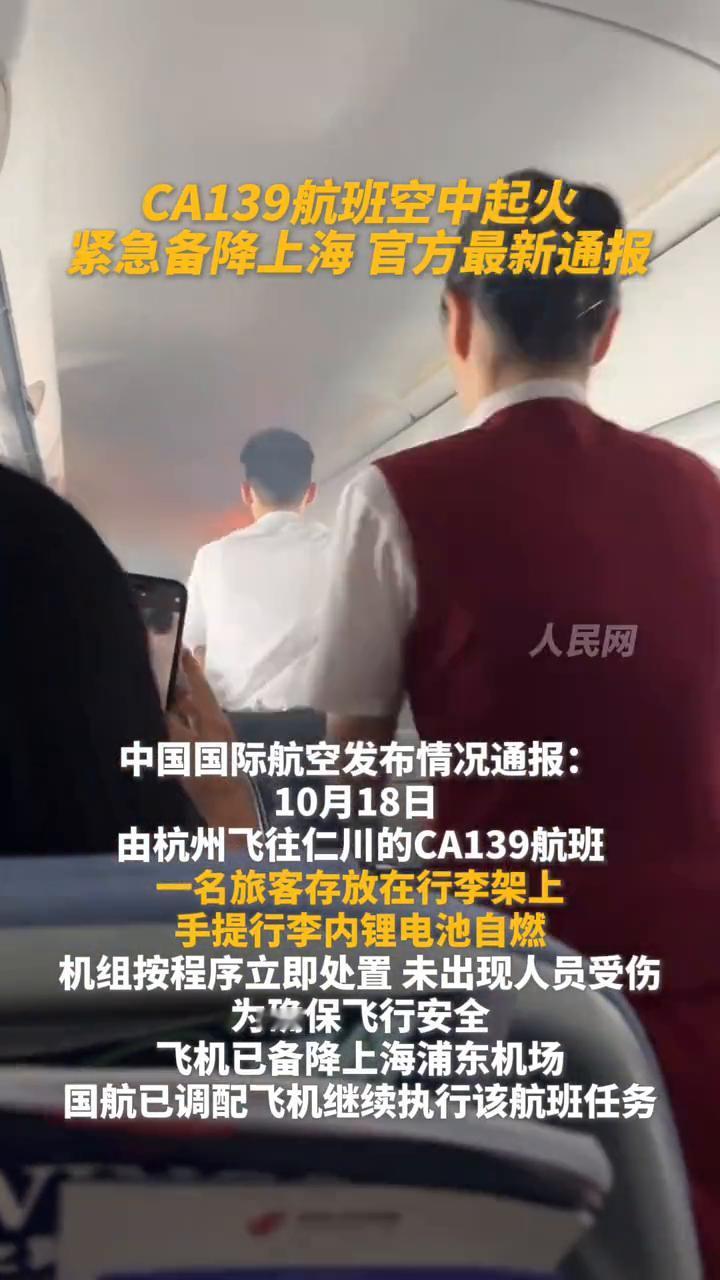CA139航班空中起火,紧急备降上海官方最新通报。 中国国际航空发布情况通报:10月18日,由杭州飞往仁川的CA139航班,一名旅客存放在行李架上,手提行李内锂电池自燃,机组按程序立即处置,未出现人员受伤。为确保飞行安全,飞机已备降上海浦东机场,国航已调配飞机继续执行该航班任务。