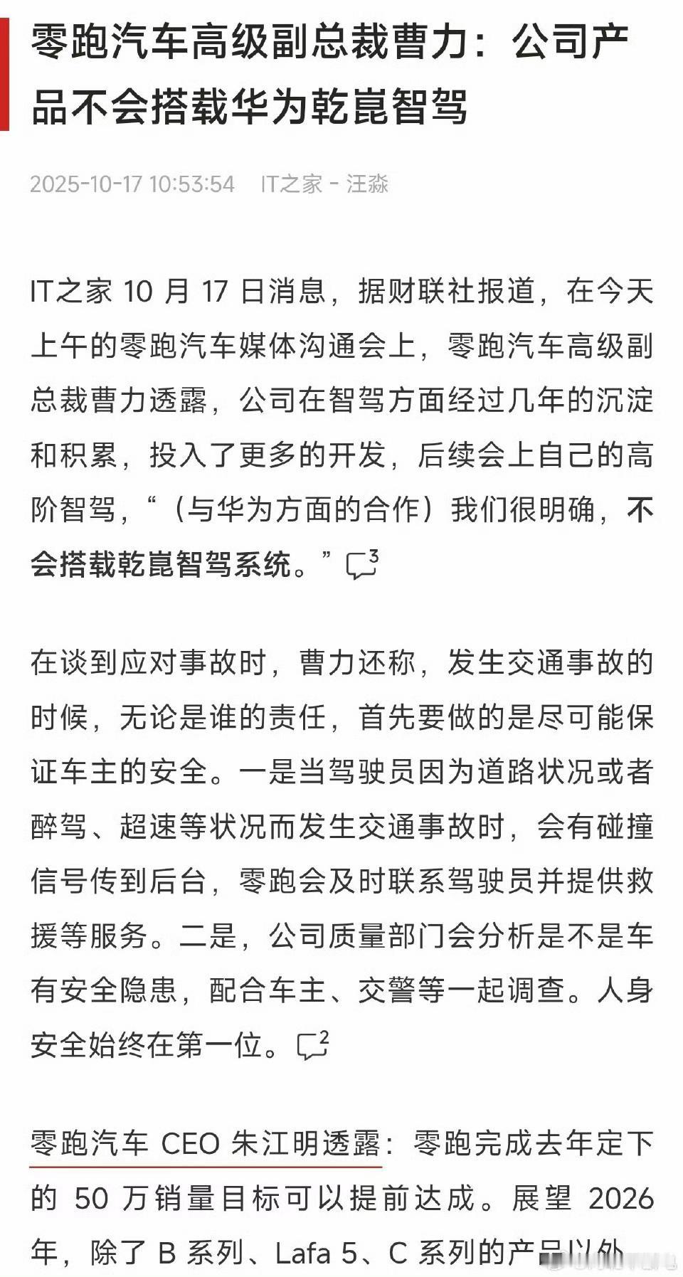 10月17日,零跑汽车高级副总裁曹力在媒体沟通会上明确表示,公司产品不会搭载华为乾崑智驾系统,后续会推出自家高阶智驾。同时他还说,发生交通事故时,不管是谁的责任,都会先保障车主安全,会及时提供救援并调查车辆是否有安全隐患。另外,零跑CEO朱江明透露,去年定下的50万销量目标能提前完成,2026年还有B系列、Lafa 5、C系列等多款产品推出。【来自懂车帝车友圈】