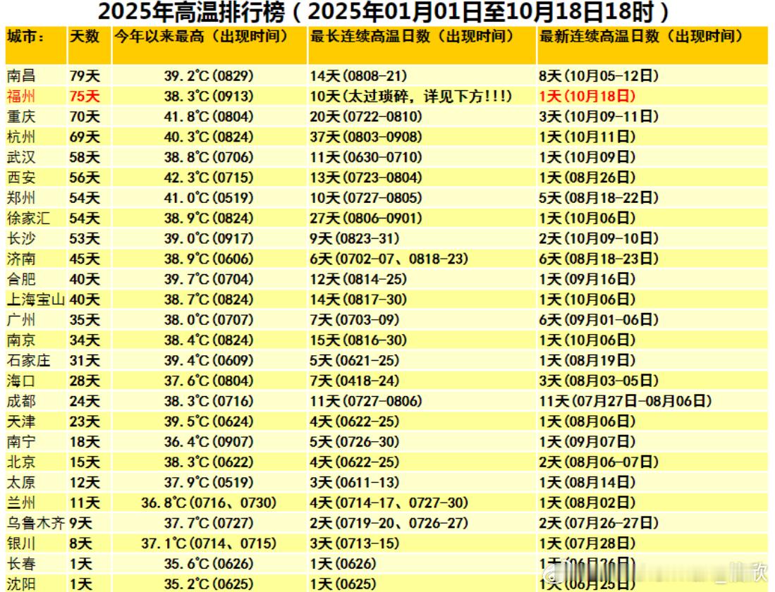 【高温】今天广东福建有5个站点出现高温。虽然不敢说今年高温就此彻底结束,但省会首府直辖市高温榜尘埃落定。南昌79天,福州75天,重庆70天,杭州69天,武汉58天,西安56天,郑州54天,上海徐家汇54天,长沙53天,济南45天,排名前十。