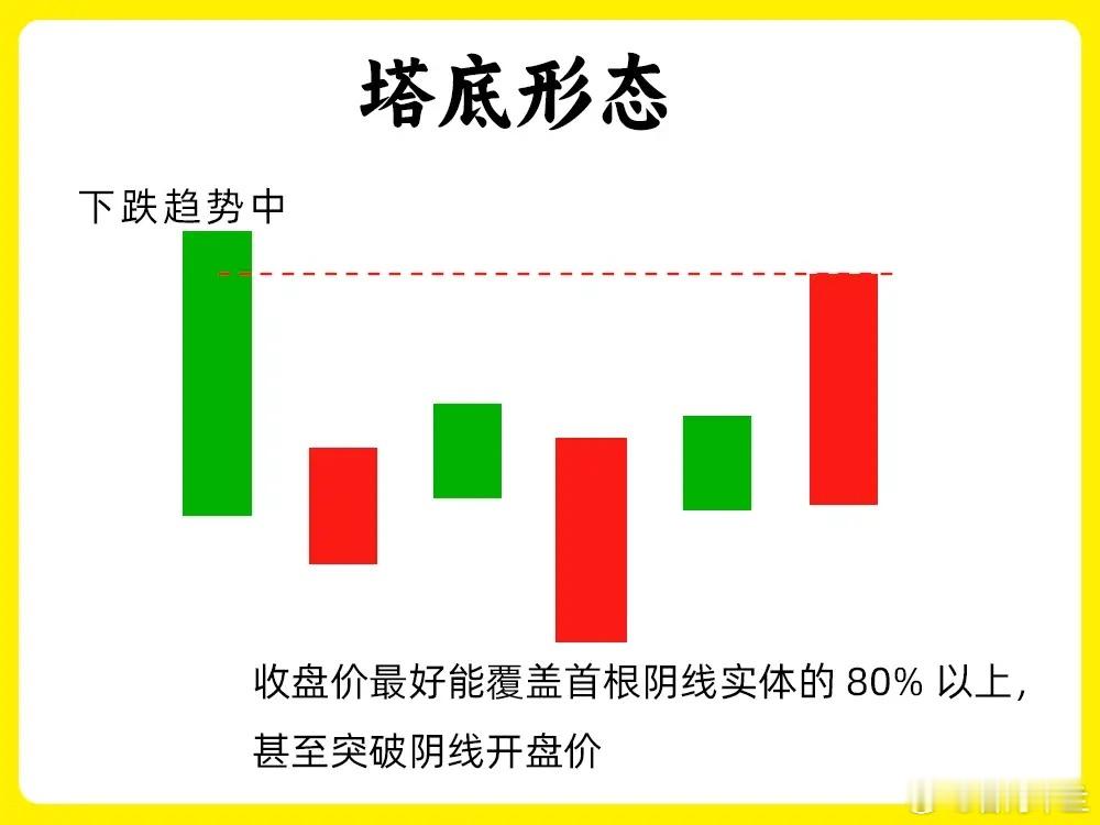 在下跌趋势的末期,先是出现一根中大阴线,这是一根参照物,随后股价开始横盘,一般都是小阴线小阳线,都在大阴线的内部运行,说明多空双方处于一个平衡,这个过程周期往往会在10个交易内,等出现一个放量阳线,来大阴线的最高价位置附近,这就是塔底形态,我们看形态五的案例图