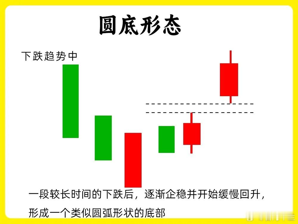 股价在下跌趋势的末期,空方的力量基本要耗尽,股价开始筑底,形成元半圆弧度的K线走势,整个底部形态比较温和没有明显尖角。成交量从下跌的放量到缩量,再到筑底的放量
