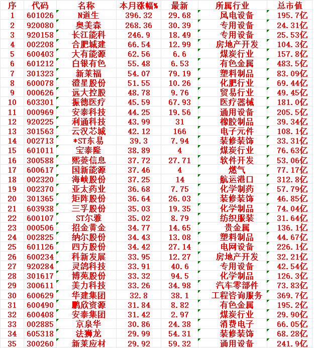 十月以来,整个市场“涨幅最强”的35名单一览! N道生:本月涨幅396.32%