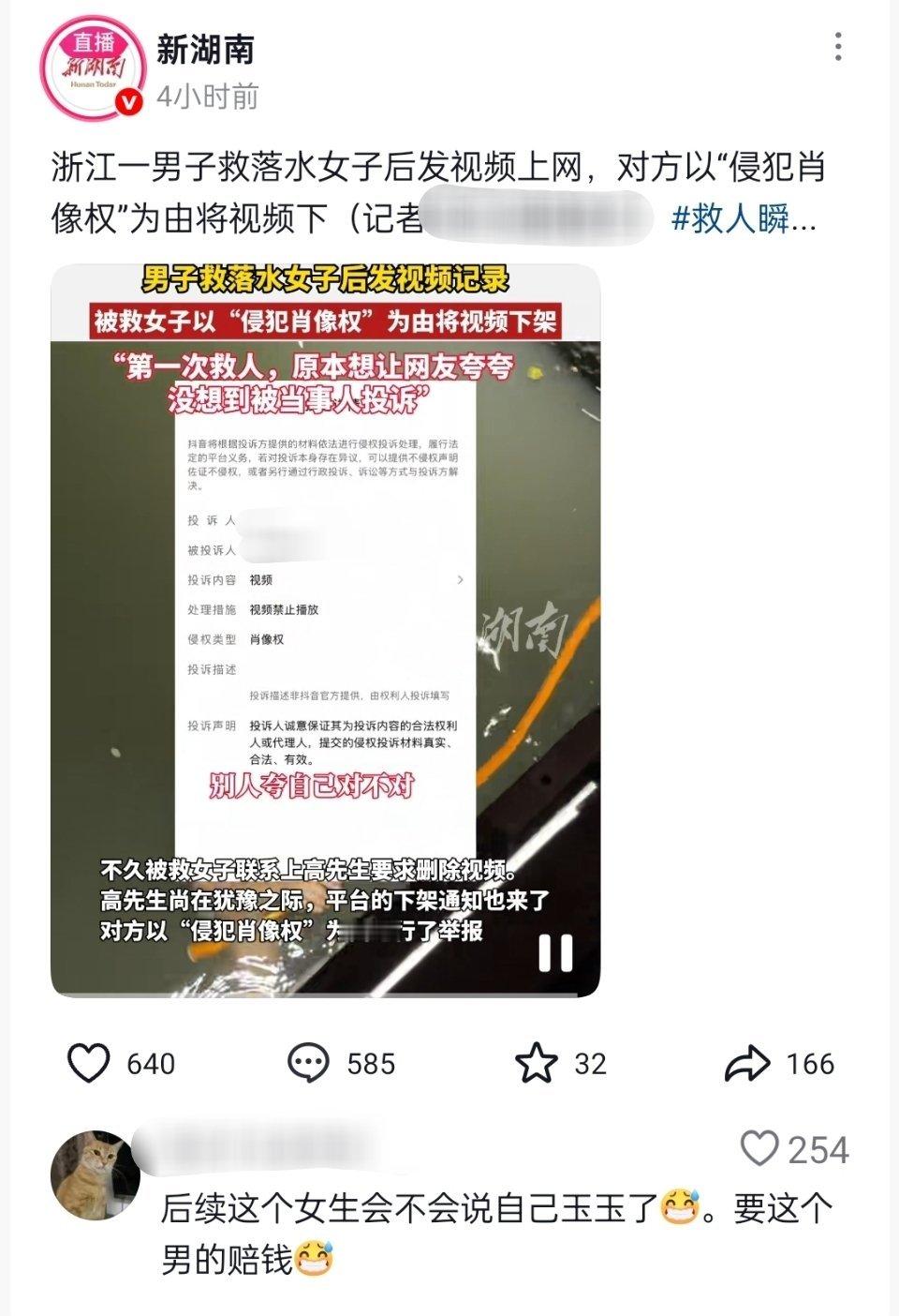 浙江一男子救落水女子后,将见义勇为的视频发到上网,被对方投诉“侵犯肖像权”。[摊手][摊手]