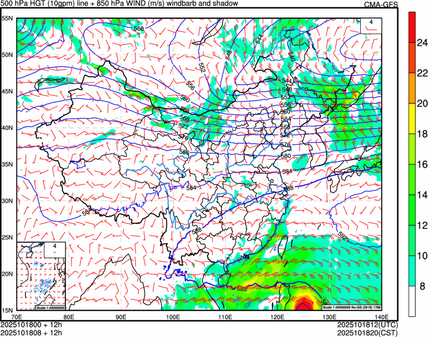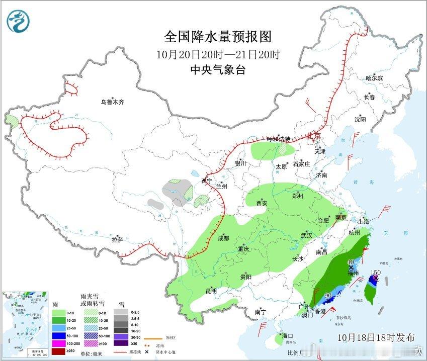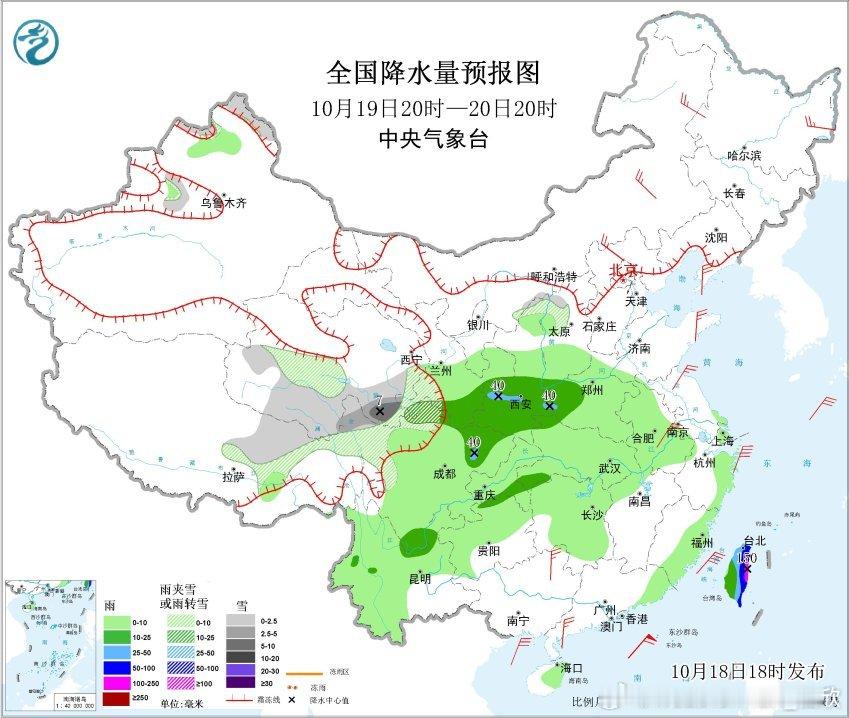 预计10月19日20时至20日20时,青海南部、甘肃西南部、川西高原北部、西藏东北部、新疆北部等地部分地区有小到中雪或雨夹雪,其中,青海东南部等地部分地区有大雪(5~7毫米)。甘肃东南部、陕西南部、河南西部、湖北西北部、四川东北部、重庆东南部、云南北部、台湾岛等地部分地区有中到大雨,其中,台湾岛北部和东部等地部分地区有暴雨或大暴雨(100~150毫米)。