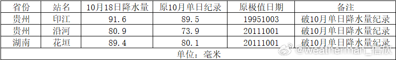 【降水】昨晚到今天,长江南北两侧出现了大范围降雨。云南贵州重庆湖南江西上海部分站点出现暴雨。贵州德江94.5毫米、印江91.6毫米、湖南花垣89.4毫米,位列前三。贵州印江、沿河、湖南花垣,均打破当地10月单日降水量纪录。明天降雨总体减弱,后天陕西河南降雨略增强,之后总体再减弱。此外东南沿海因为后期台风风神叠加冷空气影响,降雨会增多,台湾东部可能出现强降雨。