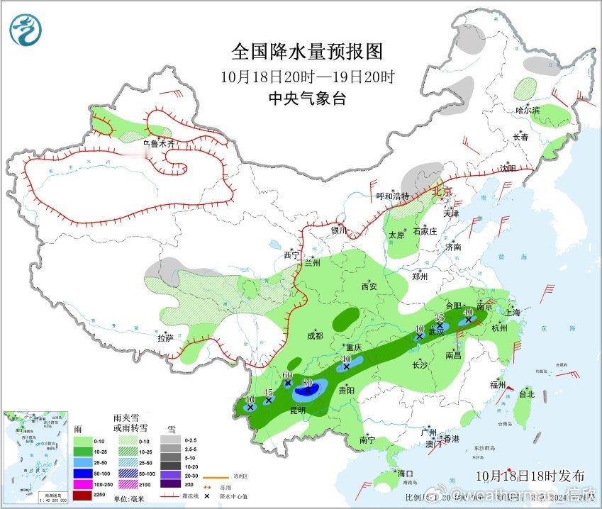 预计10月18日20时至19日20时,内蒙古东北部和中部、黑龙江西部、西藏北部、青海南部和西部、山西北部、河北北部、川西高原北部等地部分地区有小雪或雨夹雪。安徽中南部、湖北东部和南部、湖南北部、四川东部和南部、重庆东南部、贵州西部和北部、云南西部和北部等地部分地区有中到大雨,其中,四川南部、云南东北部等地局地有暴雨(50~80毫米)。