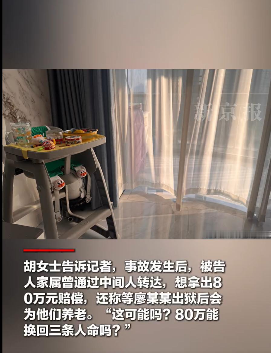 心碎!景德镇一家三口惨死 1 年,凶手想 80 万私了,审判又延期了 景德镇那场车祸过去整整一年,受害者家的日历还停在去年 10 月 2 日。 20 岁的廖某某开着车飙到 129km/h,把过马路的一家三口全撞没了,最小的宝宝才 358 天。如今事发路段加了护栏和警示灯,可三条人命再也回不来了。 被告家属曾甩来 80 万想私了,说等凶手出狱给家属养老。受害者亲戚直接怒了:“80 万能换三条命?” 干脆放弃索赔,只求死刑。 可盼到现在,审判第三次延期到明年 1 月。家属的痛苦一天天熬着,这样的等待还要多久?